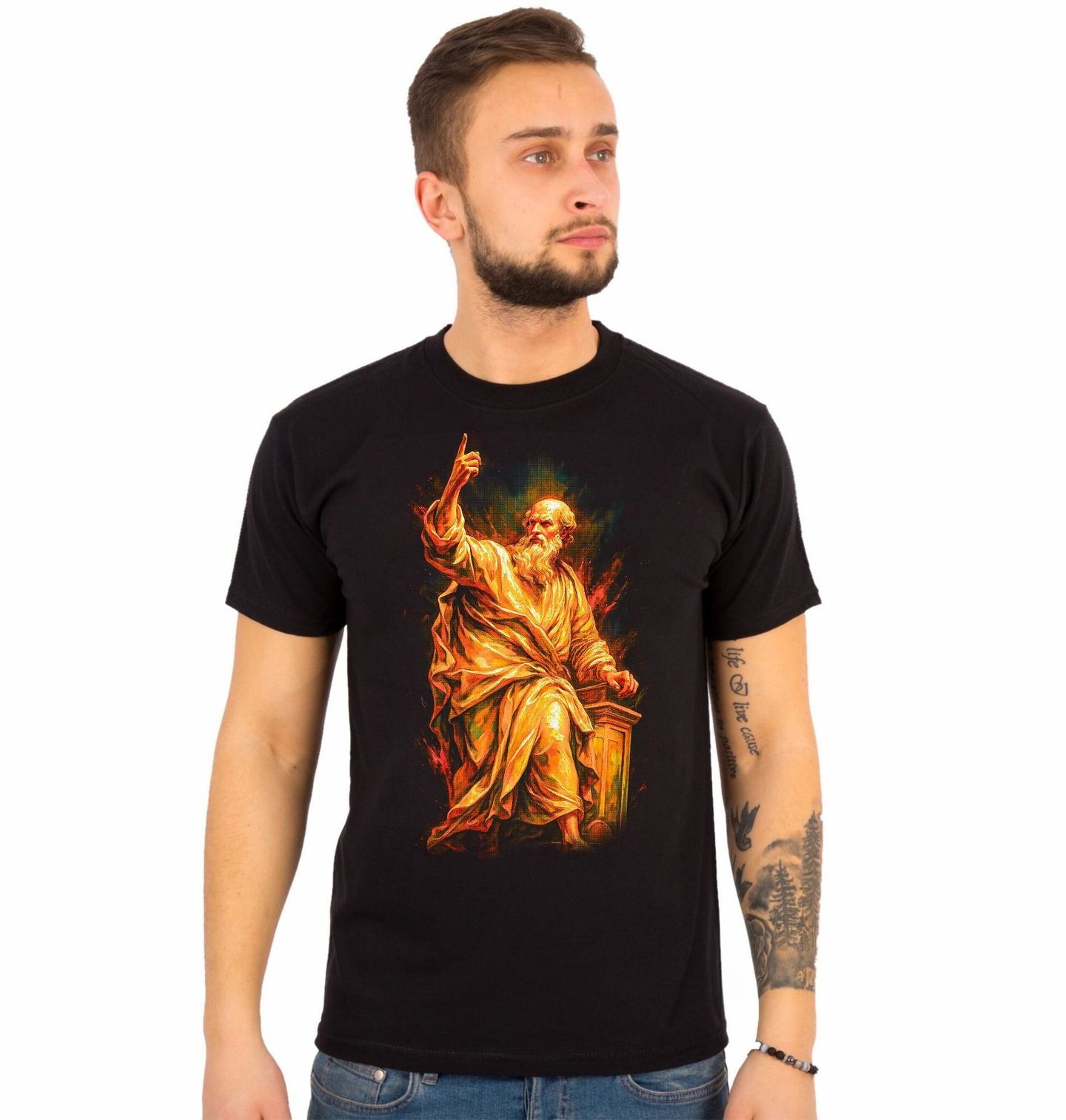 Pánské tričko Řecký Filozof Platón. Tento výrazný motiv zachycuje Platóna, ikonickou postavu antického myšlení, jehož filozofie ovlivnila celé dějiny západní civilizace. Řecká mytologie a filozofie tvořily v jeho době přirozenou součást duchovního světa – a právě z tohoto prostředí vzešly jeho slavné myšlenky o pravdě, dobru a kráse. Zvednutý prst symbolizuje odkaz k vyšší realitě – k říši idejí, která je podle Platóna skutečnější než svět kolem nás.