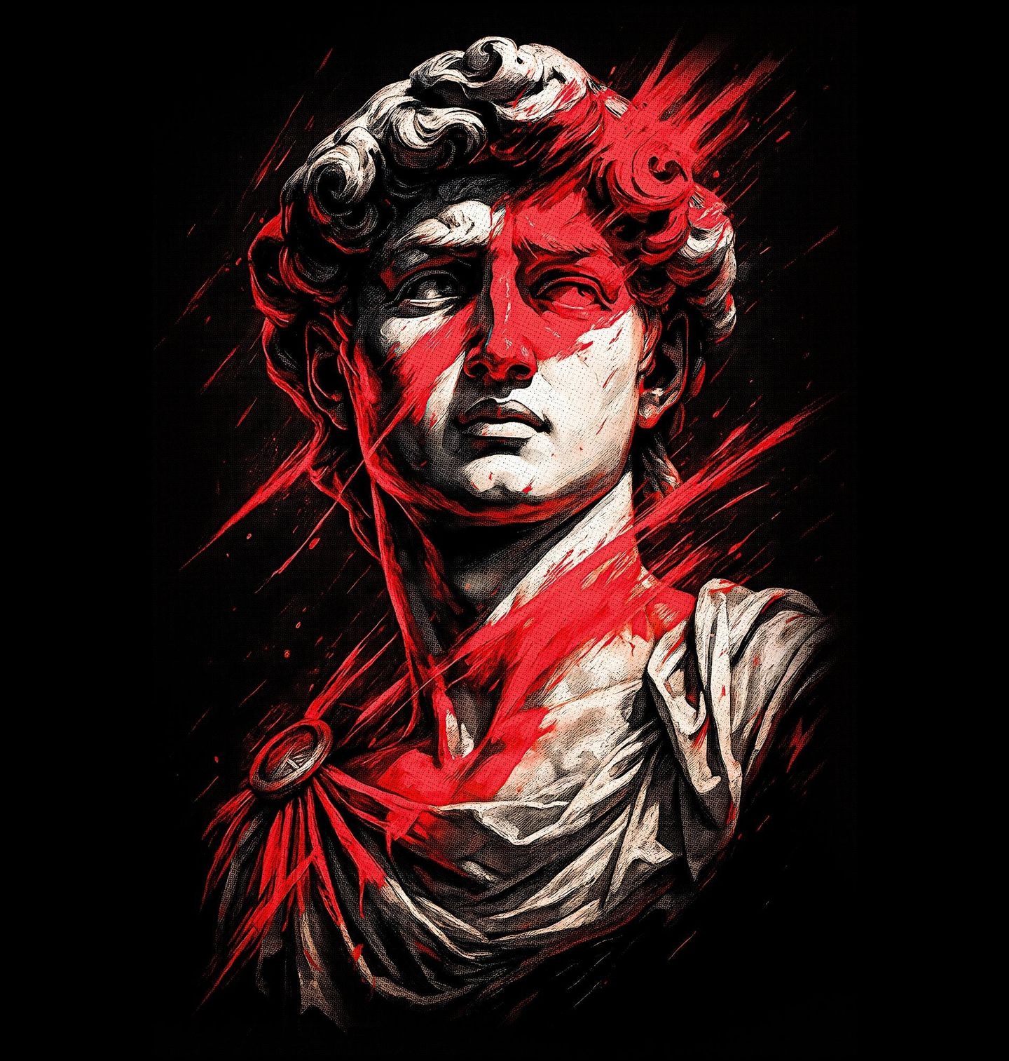 Pánské tričko Renesanční Socha Davida. Stylizace vychází z nejslavnější renesanční sochy, kterou vytvořil Michelangelo Buonarroti v letech 1501–1504. David představuje biblického hrdinu před bojem s Goliášem. Socha se stala ikonou renesančního umění a ideálu krásy, který vycházel z proporcí a harmonie, jež formovala řecká mytologie a antické sochařství.