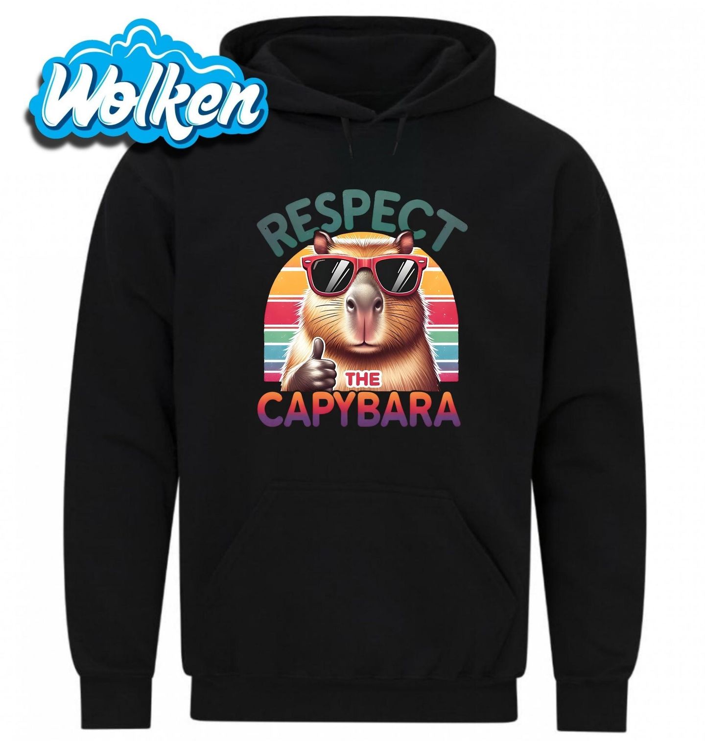 Pánská mikina Respektuj Kapybaru. Stylové tričko s motivem, kterému dominuje kapybara – nejvíc v klidu a přitom s největším respektem. Na ilustraci je kapybara s červenými slunečními brýlemi, která drží palec nahoru a kolem ní je retro duhové pozadí s nápisem Respect The Capybara (česky: Respektuj kapybaru).
