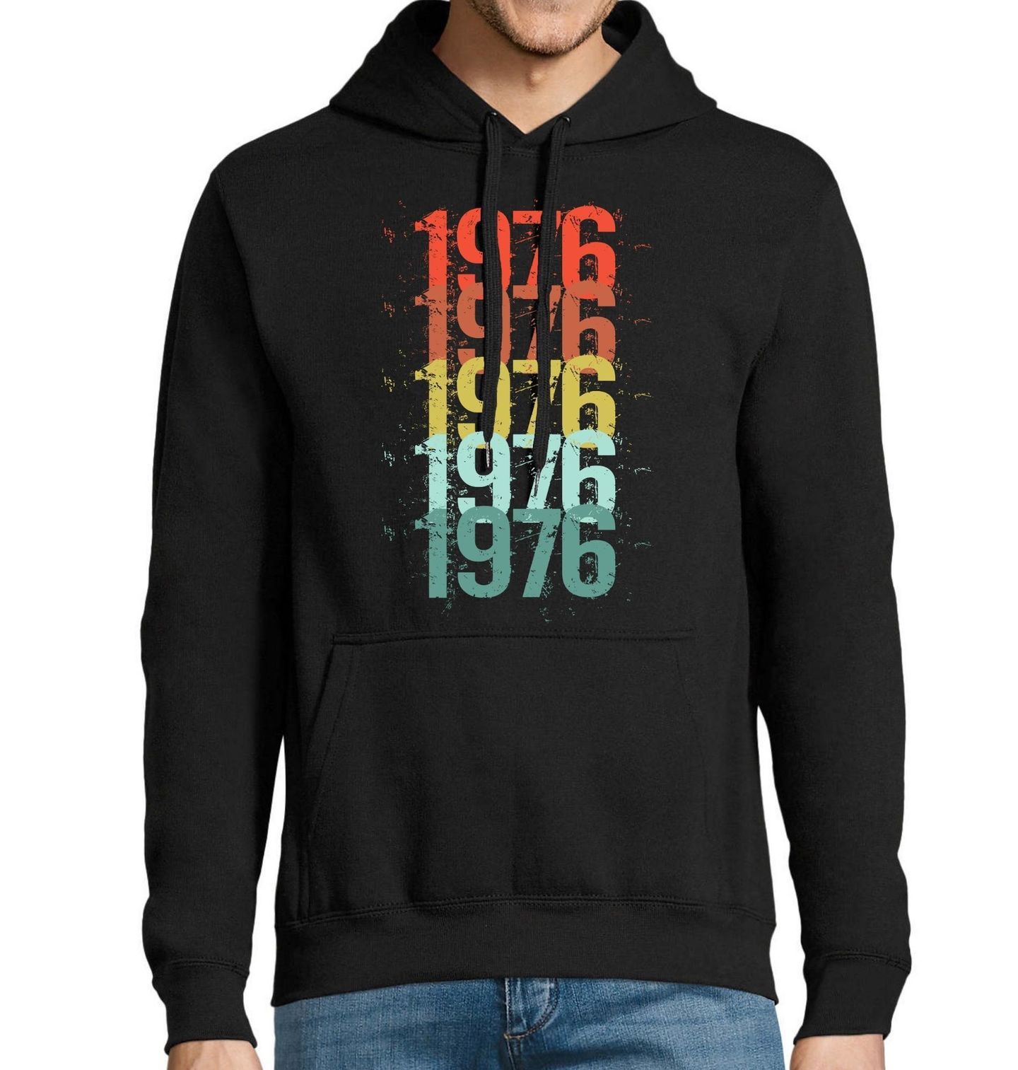 Pánská mikina Retro 1976 v Barvách. Design s výrazným nápisem „1976“, který se opakuje ve vrstvách v retro barevném přechodu od červené přes žlutou až po modrou. Celý motiv má lehce opotřebovaný vintage efekt na černém pozadí, což dodává autentický retro vzhled. Vhodný dárek pro lidi, kteří se narodili v tento rok.