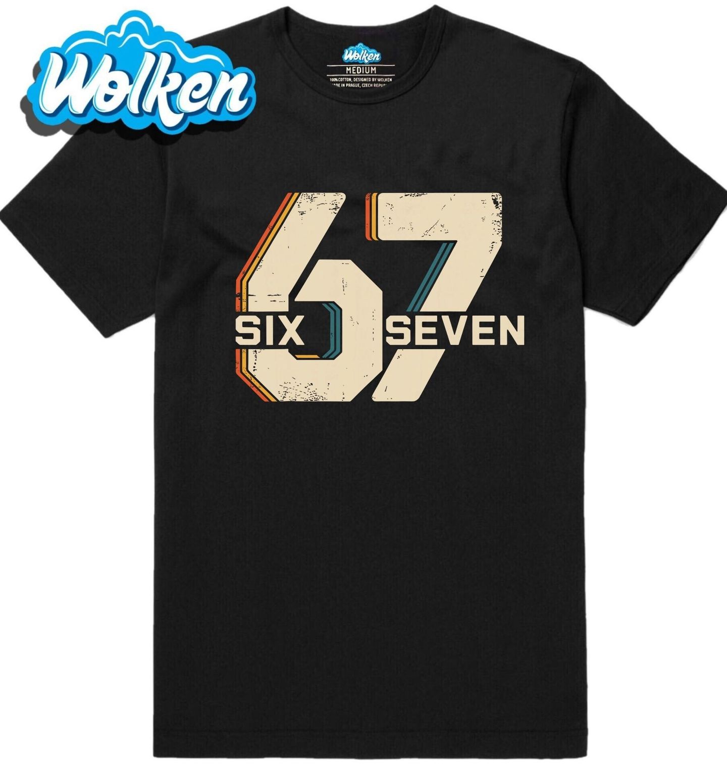 Pánské tričko Retro 67 Six Seven. Stylový motiv 67 s nápisy six a seven v ikonickém retro provedení, který odkazuje na populární internetový meme „six seven“. 67 se stalo virálním díky jednoduchému, ale chytlavému výrazu „six seven“ – bez hlubšího významu, o to víc kultovní. Ideální pro fanoušky nostalgického stylu, memů a internetové ironie.