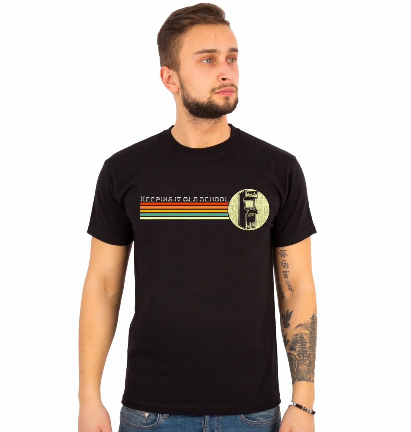 Pánské tričko Retro Arkádový Automat Keeping it old school. Stylový retro motiv inspirovaný klasickými arkádovými automaty potěší každého, kdo miluje starou herní éru. Grafika zobrazuje legendární herní kabinet a nápis „Keeping it old school“, což v překladu znamená „Držím to postaru“ nebo „Zůstávám u staré školy“. Tento design je ideální pro každého gamer, který si pamatuje začátky videoher, i pro každého hráč, jenž oceňuje jednoduchý oldschool styl a nostalgickou atmosféru.