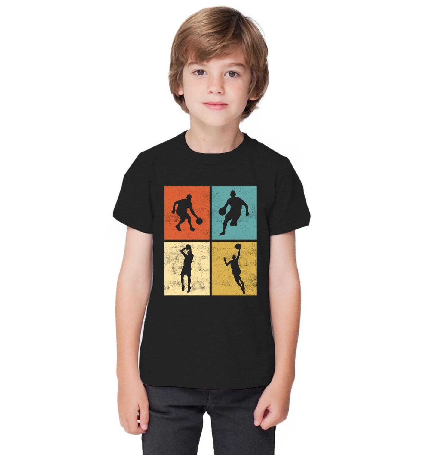 Dětské tričko Retro Basketbal v Pohybu. Energický motiv zachycuje basketbal v různých herních momentech , jako jsou driblink, střelba i výskok. Siluety postav v kombinaci s retro barevnými bloky vytvářejí výrazný vizuál, který podtrhuje rychlost a emoce, jaké sport přináší. Ideální pro každého, kdo miluje basketbal a aktivní životní styl.