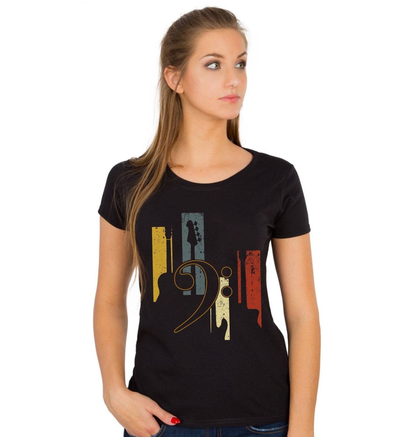 Dámské tričko Retro Baskytary. Stylový hudební motiv, který spojuje sílu tónů a výrazný vizuální design. Dominantní Basový Klíč doplněný siluetou nástroje vytváří jedinečný symbol pro každého, komu je blízká Baskytara a hluboký rytmus. Retro barevné pruhy v kombinaci s lehce patinovaným efektem dodávají motivu nadčasový vintage vzhled, který zaujme na první pohled.