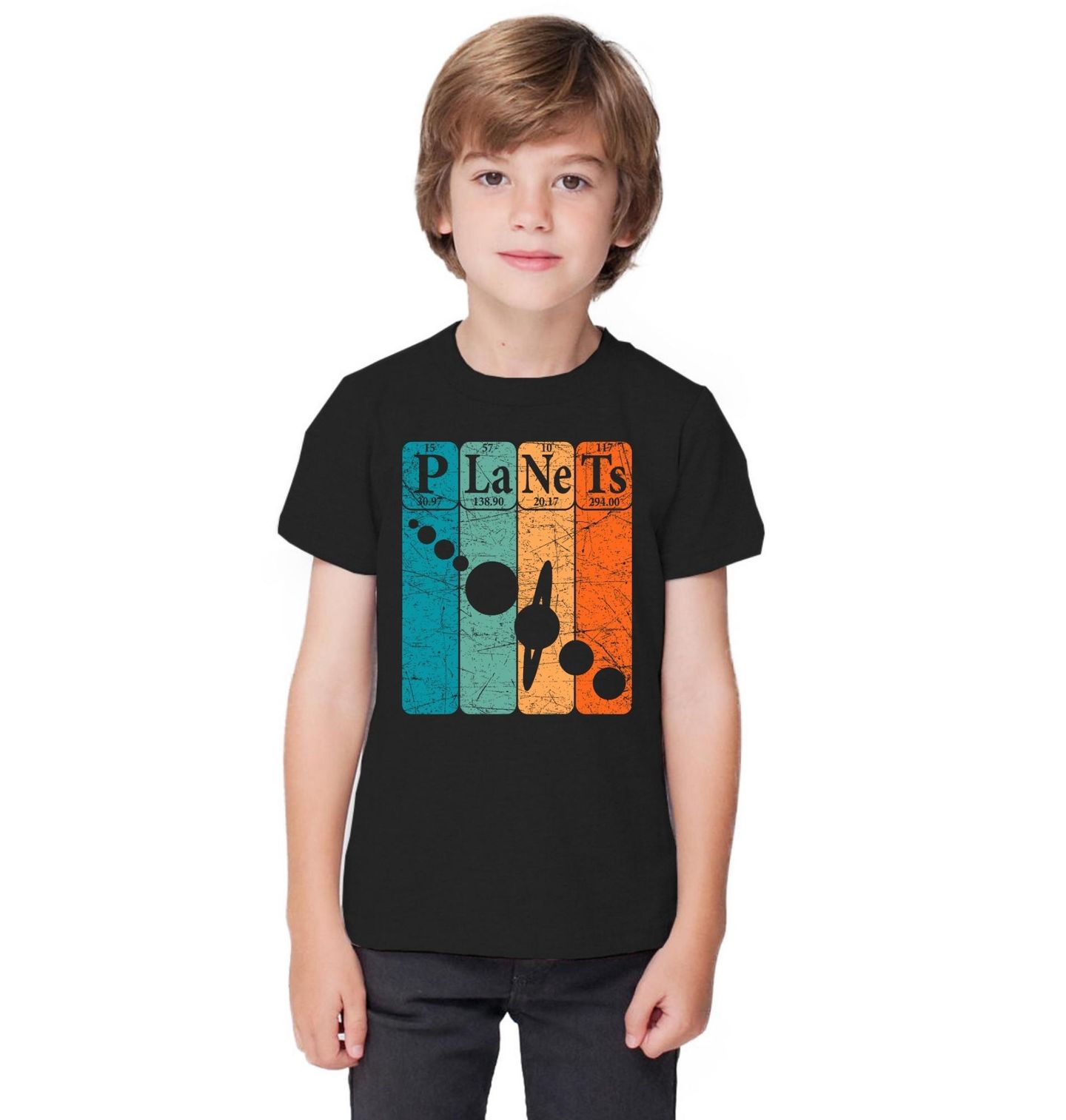 Dětské tričko Retro Chemické prvky Planets. Originální design spojuje planety a retro styl periodické tabulky. Skvělý pro studenty a fanoušky vědy či astronomie. Perfektní kombinace astronomie, chemie a vědeckého designu.