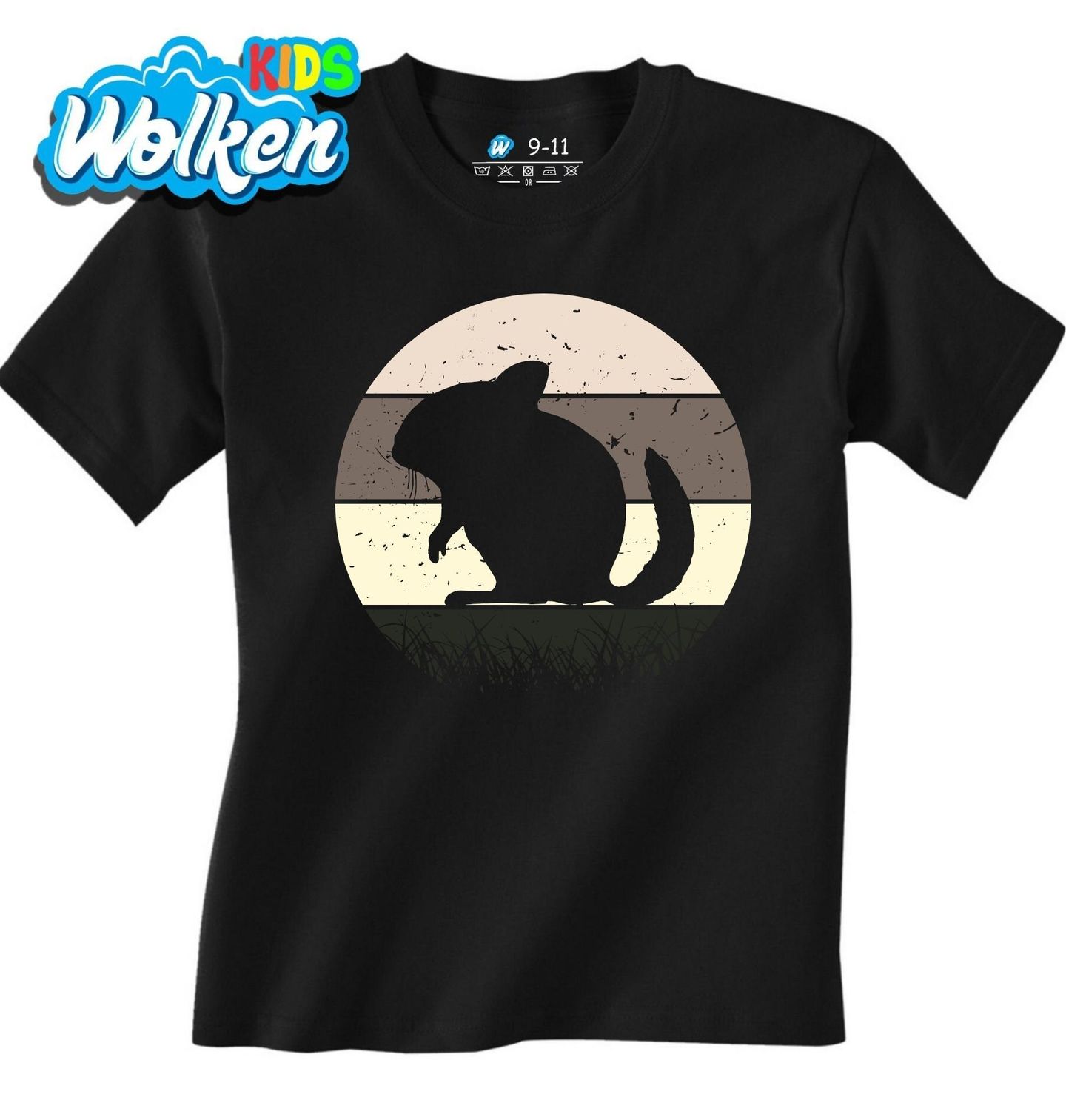 Dětské tričko Retro Činčila. Originální motiv se siluetou zvířete, které si získává srdce milovníků malých chlupáčů – hlodavec v retro stylu. Jemně vintage barevné pruhy a večerní atmosféra vytvářejí dokonalý kontrast k siluetě tohoto elegantního tvora.
