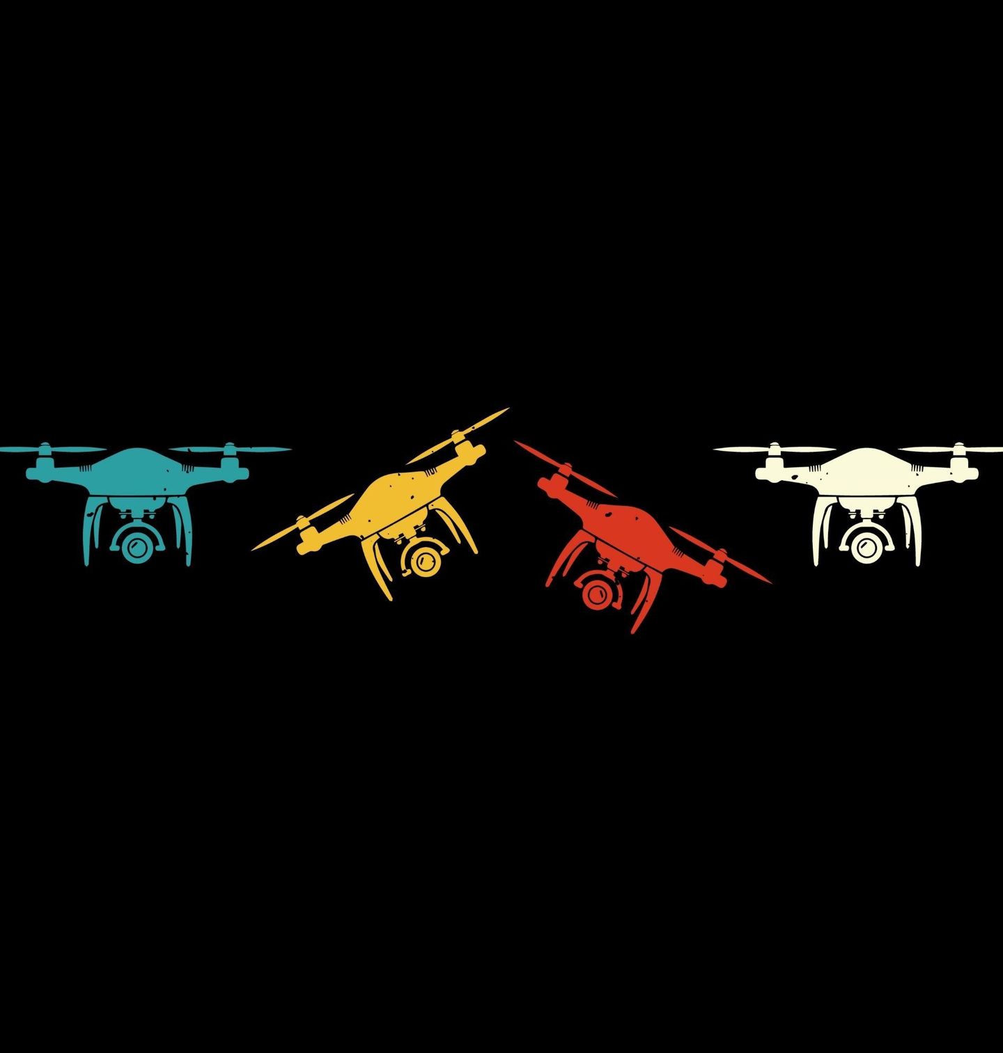 Dámské tričko Retro Drony ve Vzduchu. Motiv zobrazuje čtyři drony v různých barevných variantách, uspořádané vedle sebe na tmavém pozadí. Motiv představuje stylizované drony, inspirované běžnými kamerovými kvadrokoptérami používanými pro letecké snímkování, hobby létání i moderní technologie obecně. Barevné provedení dodává designu dynamiku a lehce retro nádech.