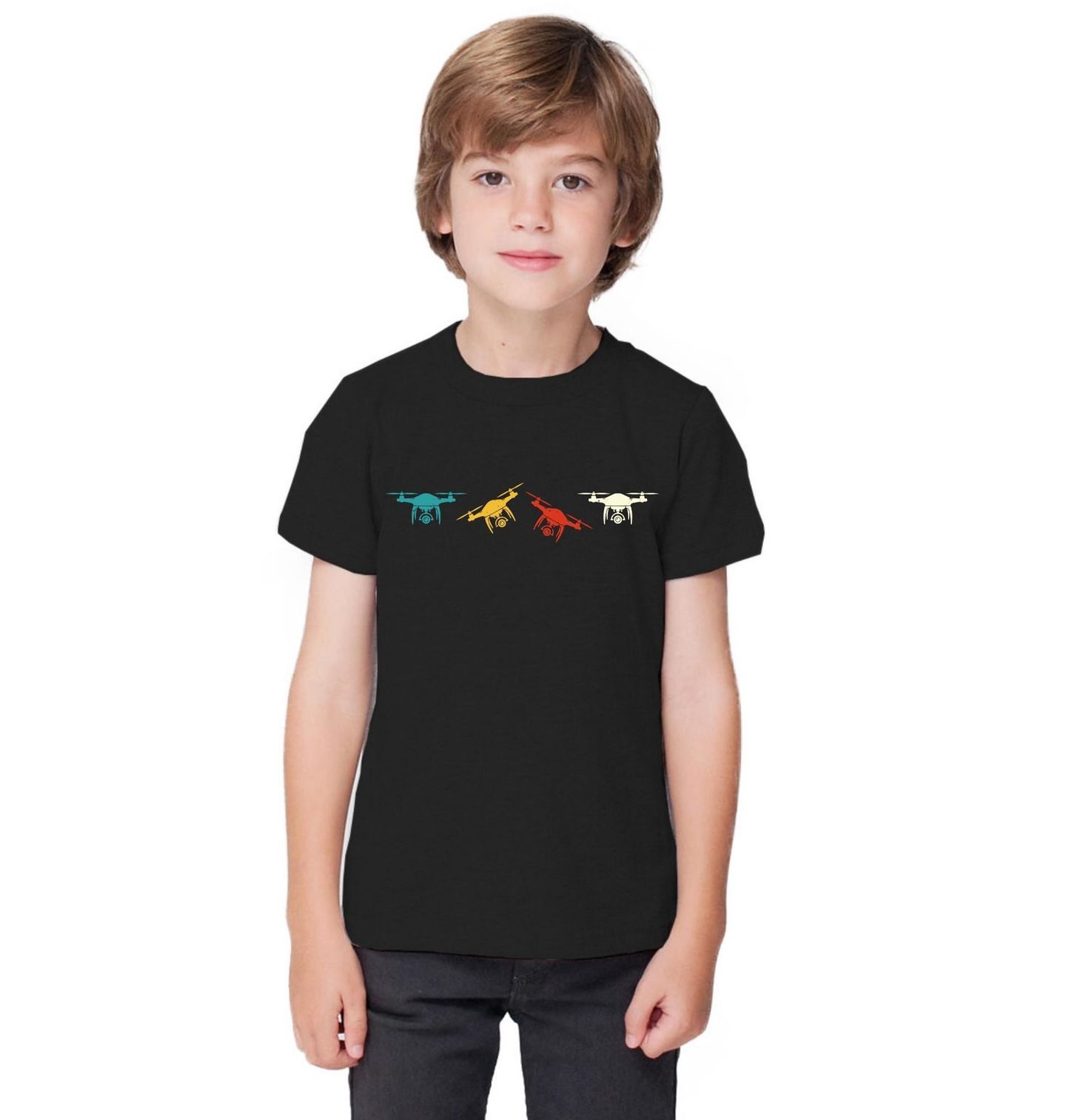 Dětské tričko Retro Drony ve Vzduchu. Motiv zobrazuje čtyři drony v různých barevných variantách, uspořádané vedle sebe na tmavém pozadí. Motiv představuje stylizované drony, inspirované běžnými kamerovými kvadrokoptérami používanými pro letecké snímkování, hobby létání i moderní technologie obecně. Barevné provedení dodává designu dynamiku a lehce retro nádech.