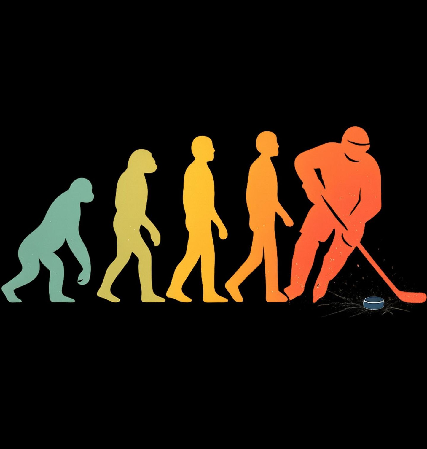 Dětské tričko Retro Evoluce Hokeje. Kreativní motiv zobrazující evoluci člověka od primitivních forem až po moderního hokejistu. Design ukazuje, že hokej je vrcholem „vývoje“ pro každého fanouška tohoto sportu. Kombinace siluet a barevného přechodu dodává grafice moderní a atraktivní vzhled. Perfektní volba pro ty, kteří berou hokej jako přirozenou součást svého života.
