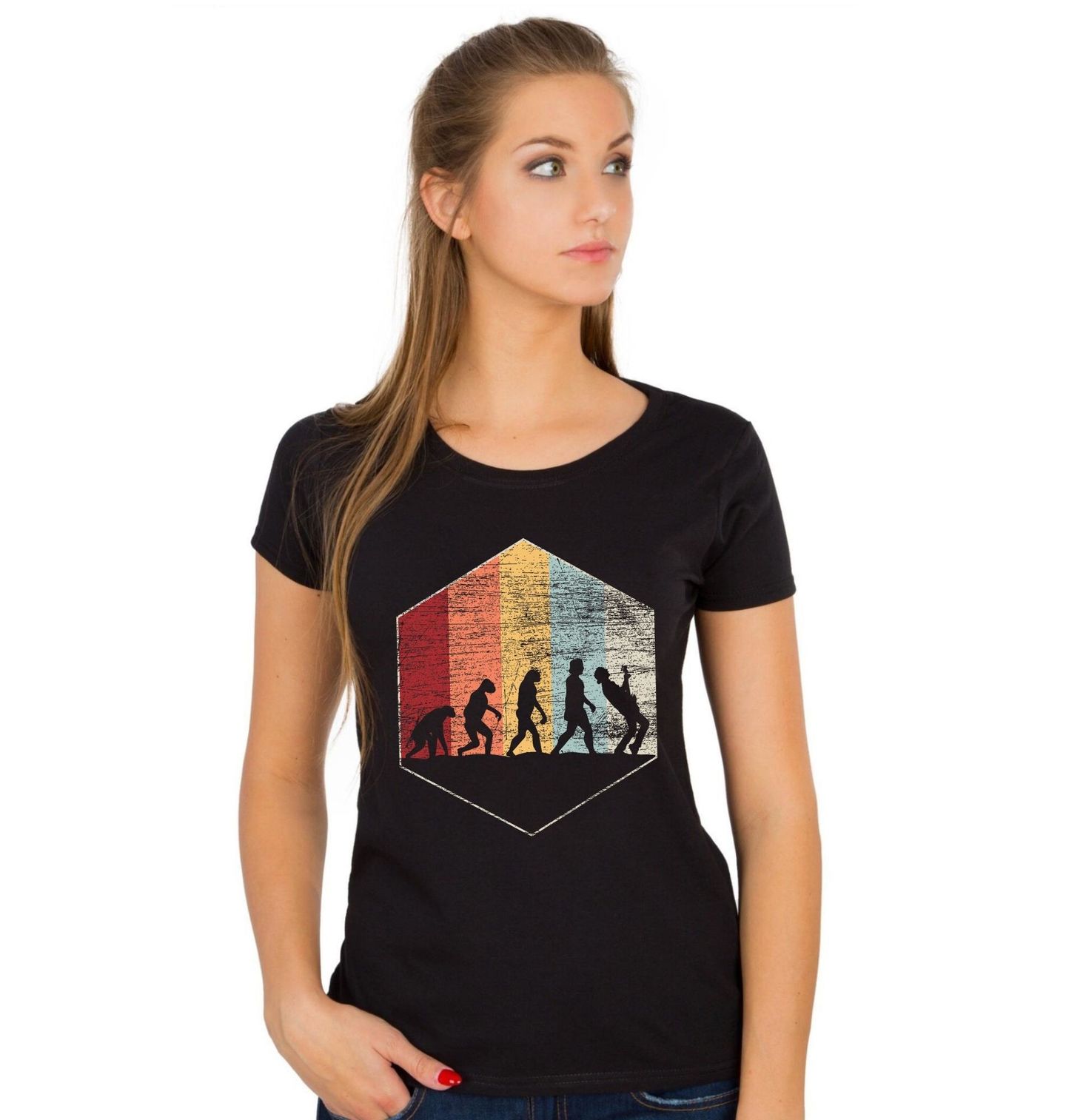 Dámské tričko Retro Evoluce Kytaristy. Výrazné retro barvy a vintage textura dodávají motivu nadčasový vzhled inspirovaný hudební kulturou a svobodným životním stylem. Tento motiv spojuje humor, retro estetiku a vášeň pro rock and roll do jedinečného vizuálu, který zaujme každého milovníka hudby a originálních designů.