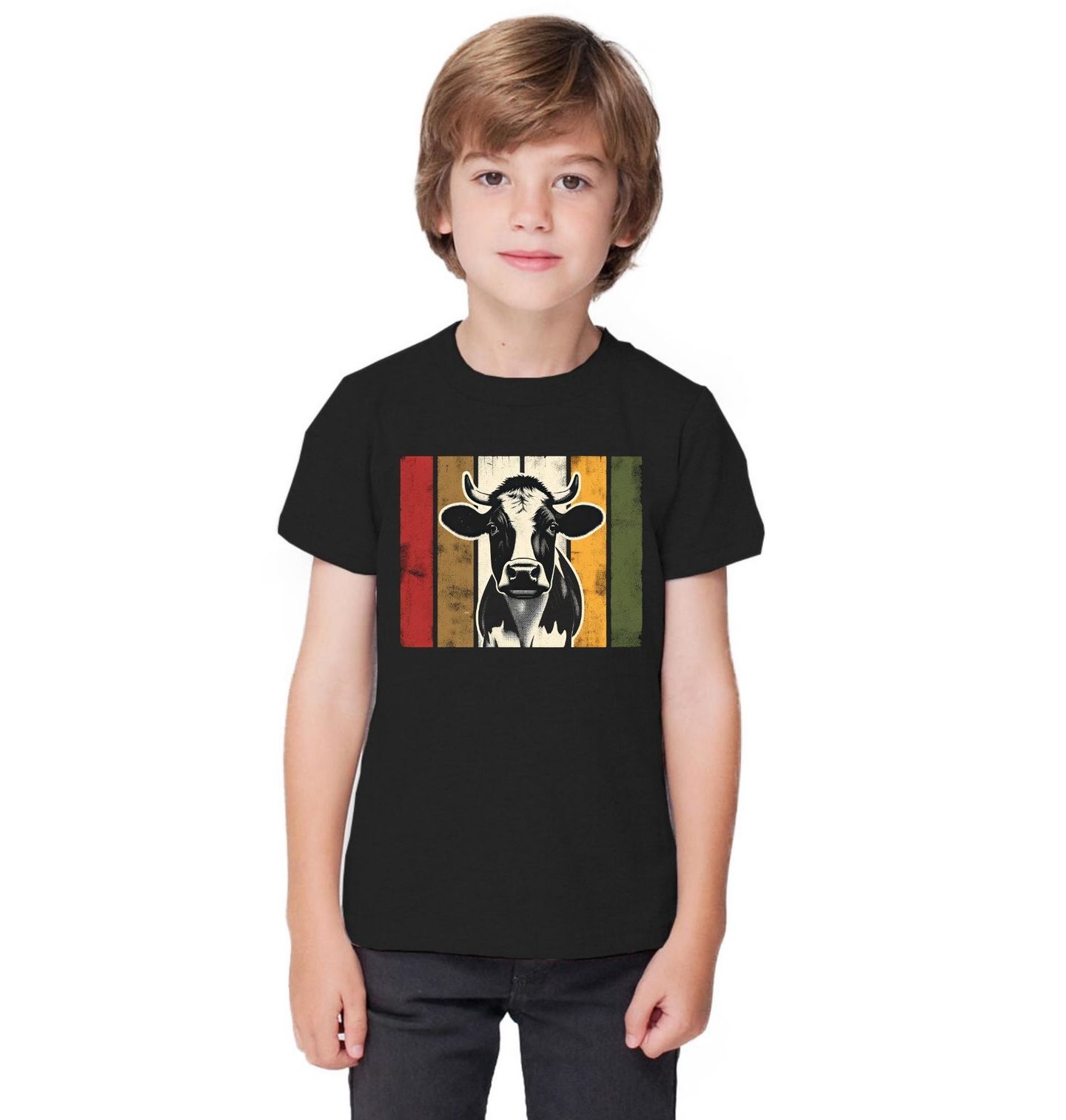 Dětské tričko Retro Farmářská kráva. Tento design zaujme milovníky venkova, farmářského života i stylového minimalismu. Kráva je zasazena do proužkového pozadí v zemitých barvách, které připomínají staré farmářské plakáty. Ideální pro farmáře a zemědělce.