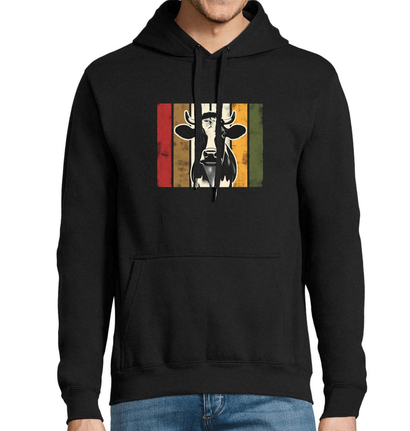 Pánská mikina Retro Farmářská kráva. Tento design zaujme milovníky venkova, farmářského života i stylového minimalismu. Kráva je zasazena do proužkového pozadí v zemitých barvách, které připomínají staré farmářské plakáty. Ideální pro farmáře a zemědělce.