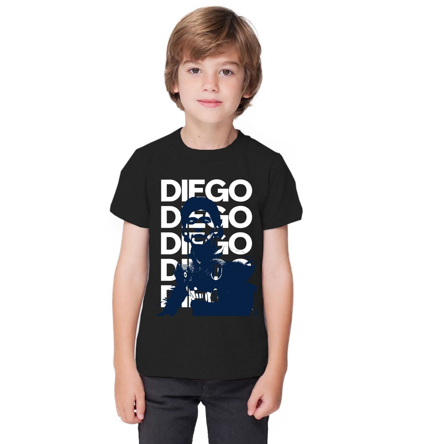 Dětské tričko Retro Fotbalová Legenda Diego Maradona. Silueta hráče doplněná opakujícím se nápisem vytváří dynamický design inspirovaný legendární atmosférou stadionů a jménem diego maradona, které se stalo symbolem vášně pro fotbal. Minimalistické barevné zpracování dodává motivu nadčasový vzhled a potěší každého fanouška, pro kterého je fotbal životní styl.