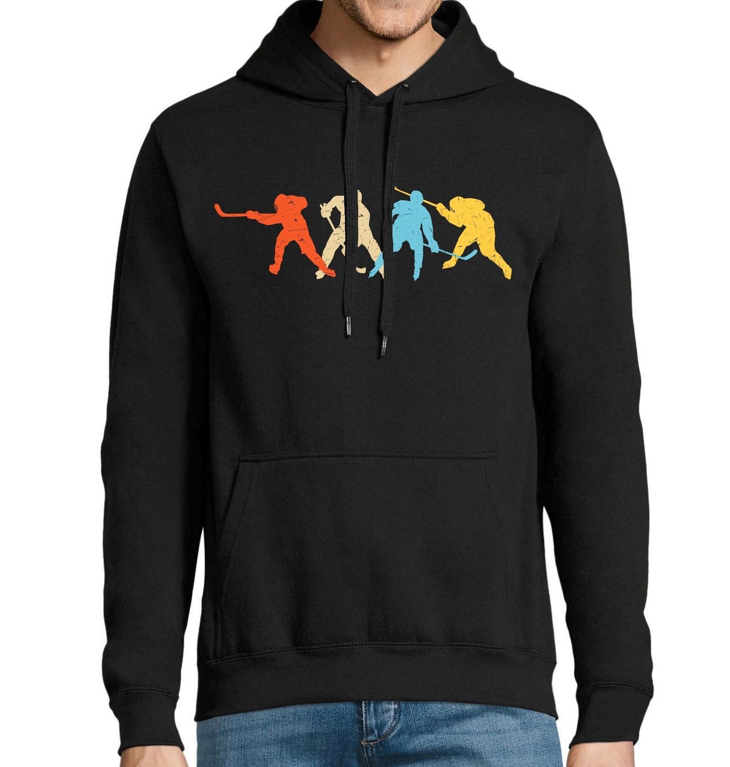 Pánská mikina Retro Hokejisté na Ledě. Originální design zachycuje skupinu hráčů v ikonickém momentu hry, kdy začíná souboj o puk. Tento motiv spojuje dynamiku, kterou nabízí hokej, s barevným nádechem retro stylu, který připomíná klasickou éru sportovních grafik. Silně stylizované siluety v různých barvách dodávají motivu energii a jedinečný vzhled. Díky tomu vynikne každý detail pohybu a akce, kterou tento sport přináší na led.