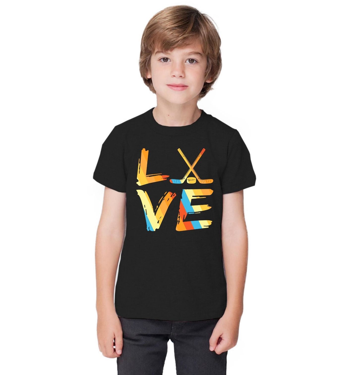 Dětské tričko Retro Hokejová láska LOVE. Stylový a hravý motiv, který spojuje vášeň pro hokej s výrazným nápisem LOVE v barevném retro provedení. Hokejky a puk tvoří originální symboliku, která jasně ukazuje, že tenhle sport není jen hra, ale skutečná láska. Barevná kombinace a vintage vzhled dodávají designu jedinečný charakter, díky kterému zaujme na první pohled.