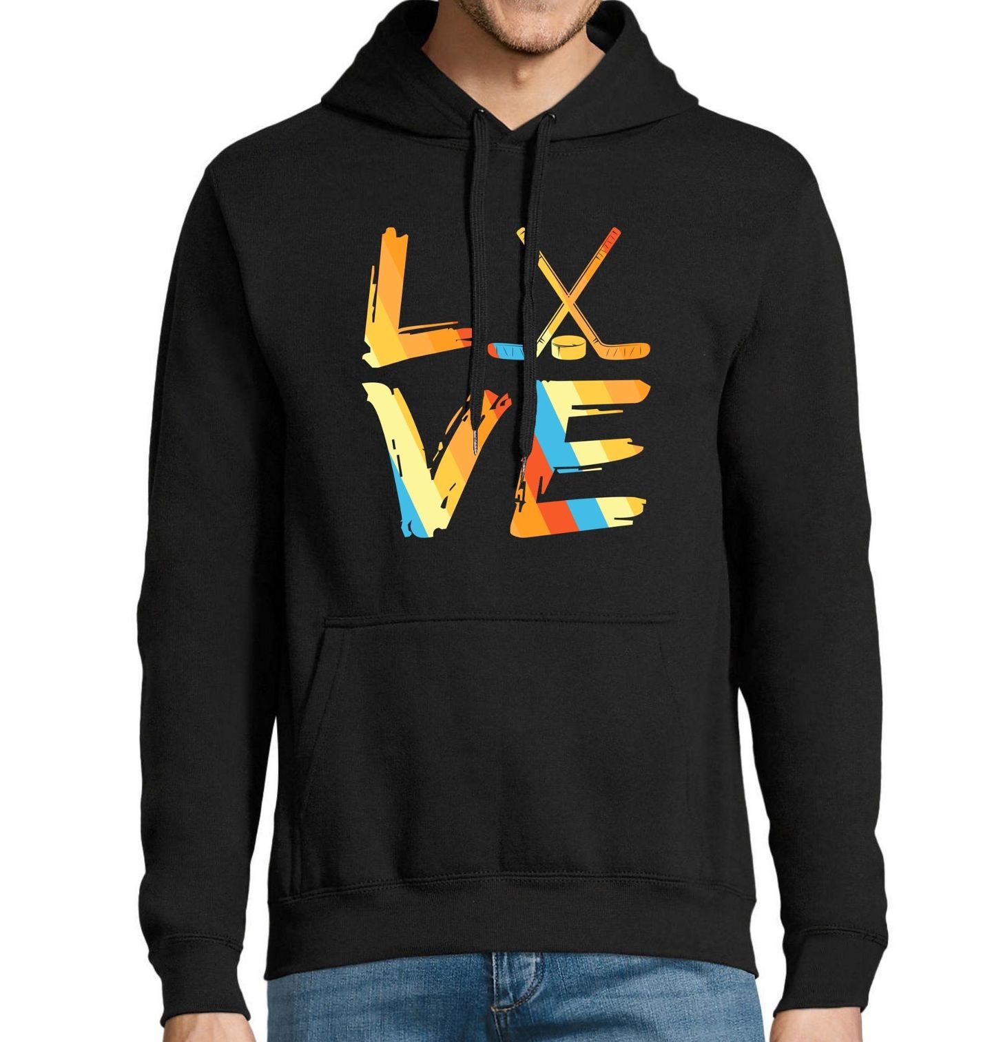 Pánská mikina Retro Hokejová láska LOVE. Stylový a hravý motiv, který spojuje vášeň pro hokej s výrazným nápisem LOVE v barevném retro provedení. Hokejky a puk tvoří originální symboliku, která jasně ukazuje, že tenhle sport není jen hra, ale skutečná láska. Barevná kombinace a vintage vzhled dodávají designu jedinečný charakter, díky kterému zaujme na první pohled.