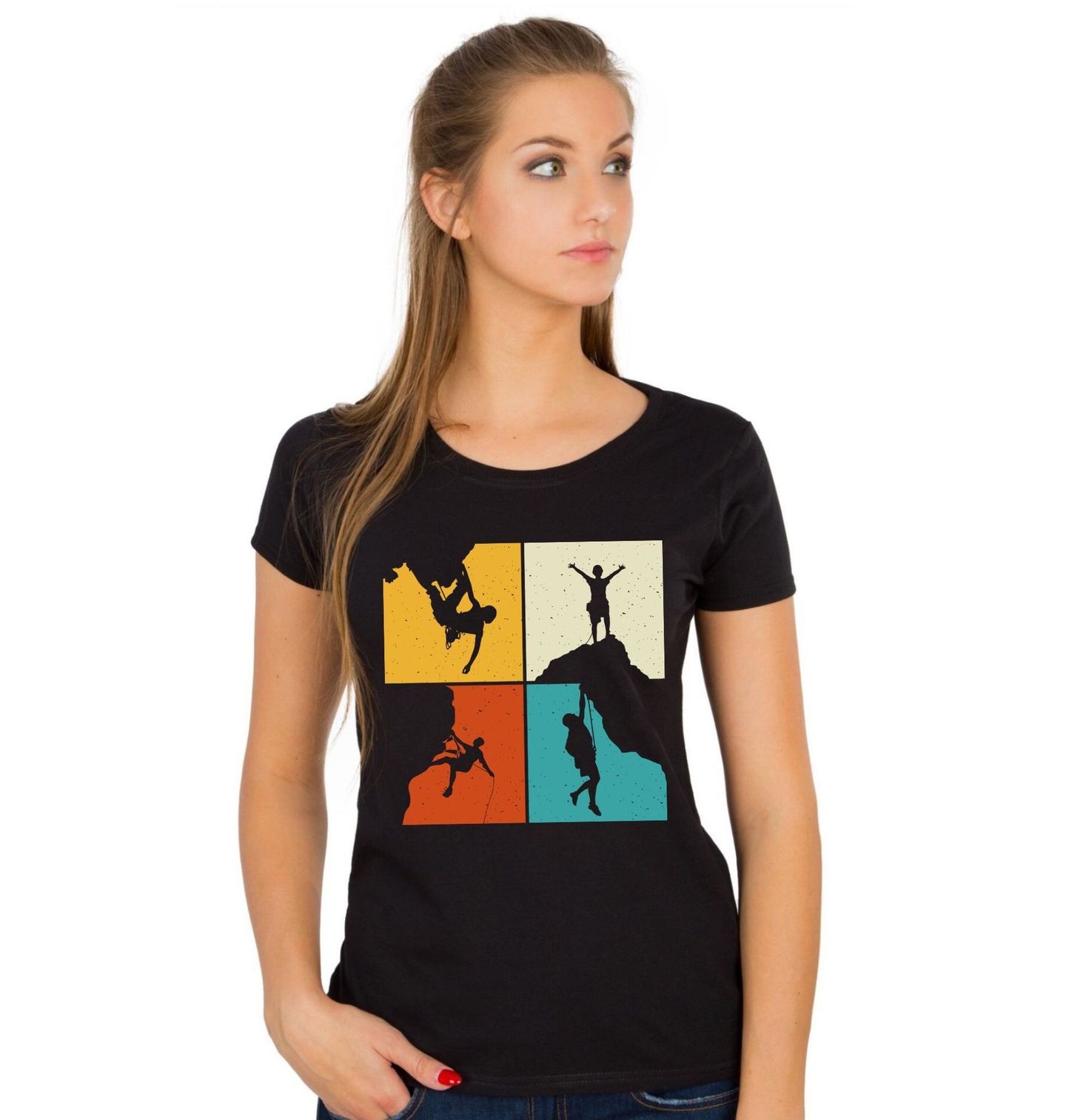 Dámské tričko Retro Horolezectví Cesta na Vrchol. Stylový retro motiv zachycuje horolezectví ve čtyřech ikonických momentech – lezení, slaňování, výstup i vítězství na vrcholu. Siluetová grafika v kontrastních barvách připomíná staré outdoorové plakáty a osloví každého, kdo miluje hory, svobodu a výzvy.