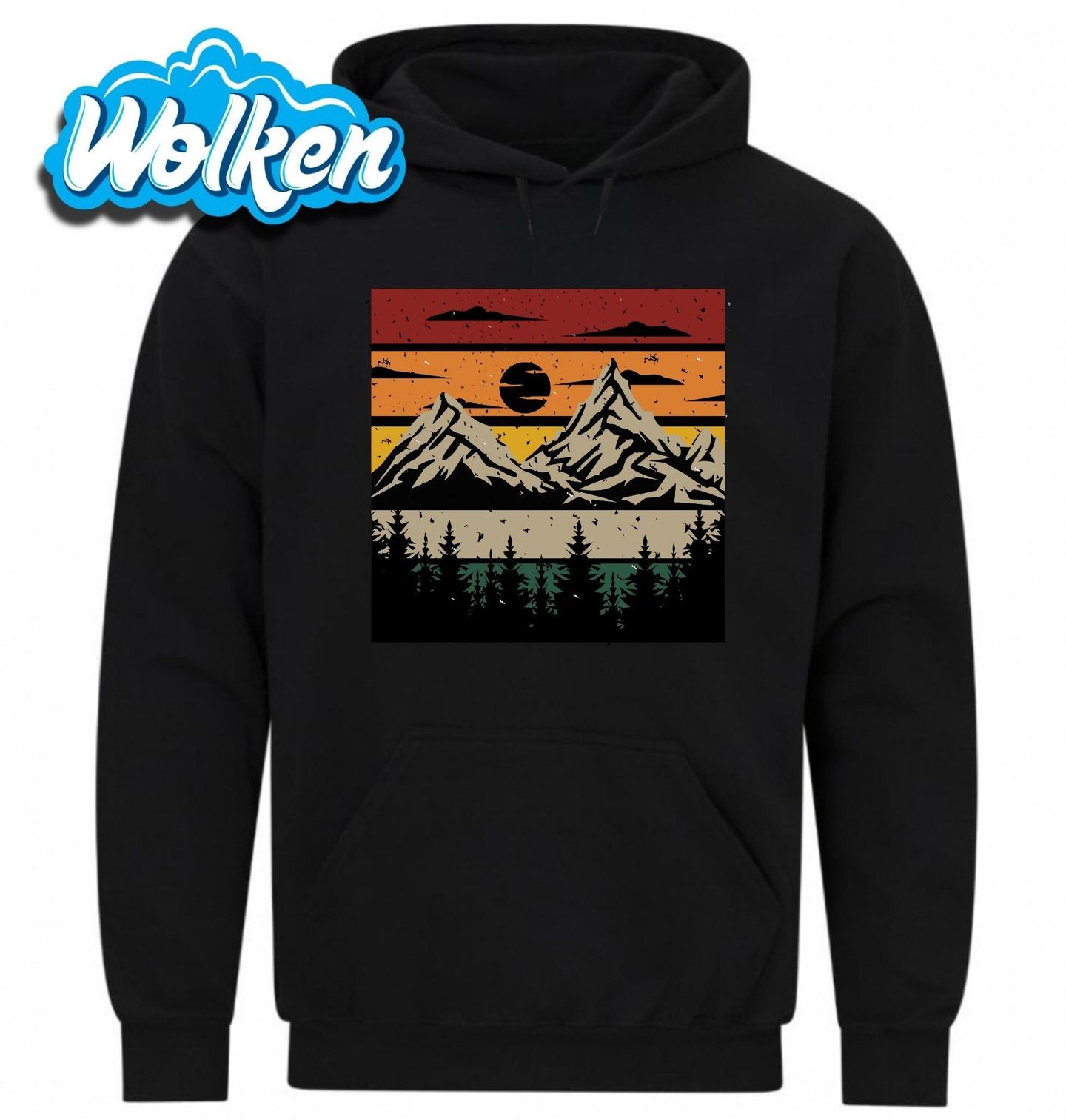 Pánská mikina Retro Horská Krajina. Pro milovníky dobrodružství a volnosti! Tento retro design zachycuje majestátní hory, hluboký les a nádherný horizont v barvách zapadajícího slunce. Ideální pro každého, kdo miluje přírodu a cestování.