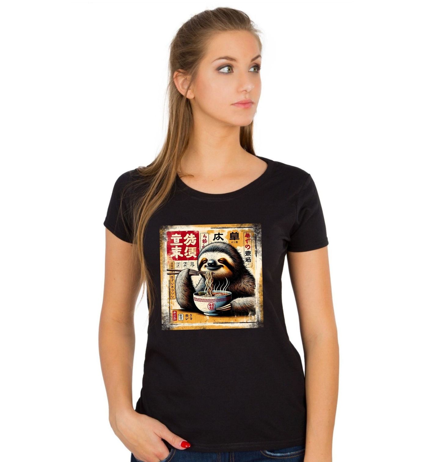 Dámské tričko Retro Japonský Plakát Lenochod a Ramen. Rozkošný lenochod si v klidu vychutnává horký ramen ve stylu vintage plakátu – ideální motiv pro všechny, kdo milují pohodu a humor. Design spojuje humor, chill atmosféru a lásku k asijské kuchyni. Tento hravý design působí vtipně, originálně a potěší každého, kdo má rád jídlo, zvířata a Japonsko.