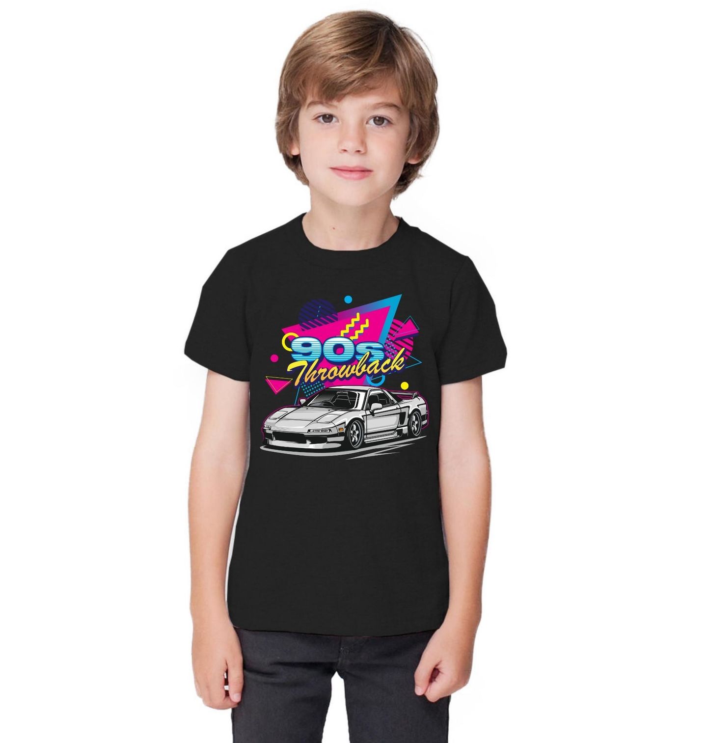 Dětské tričko Retro JDM Auto 90s Throwback. Stylový retro motiv připomíná zlatou éru devadesátých let, kdy Japonsko určovalo směr sportovních vozů a tuningové scény. Výrazné barvy, geometrické tvary a ikonické sportovní auto vytváří design inspirovaný 90s estetikou a JDM kulturou. Tento motiv zachycuje legendární sportovní auto Honda NSX, které patří mezi nejslavnější japonské supersporty.