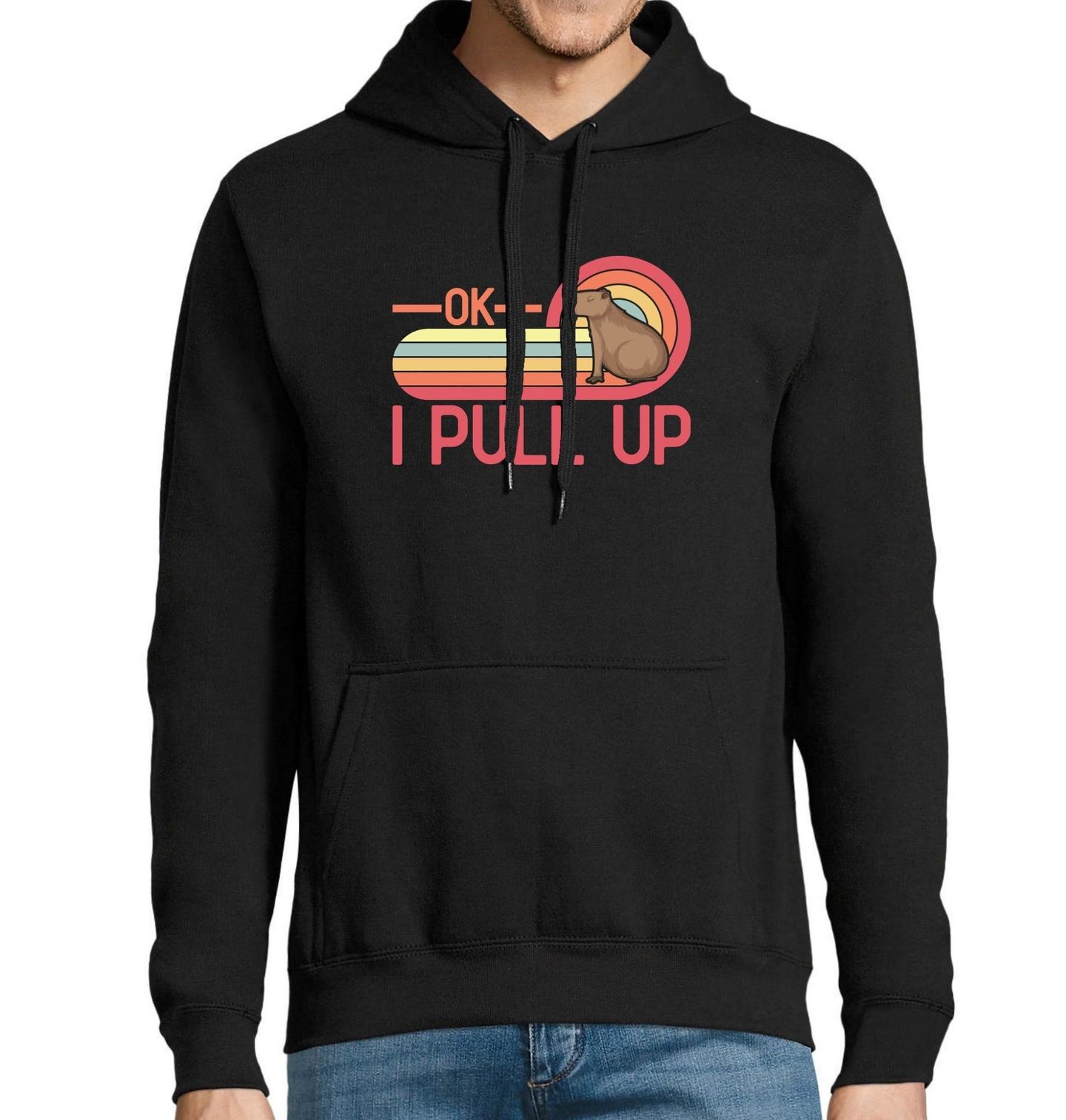 Pánská mikina Retro Kapybara OK I Pull Up. Vtipný a stylový motiv, kde hlavní roli hraje ikonický hlodavec s nápisem „OK I PULL UP“ česky „OK, dorážím“ – odkaz na populární internetový meme a virální trend. Design v retro barvách a minimalistickém stylu zaujme každého fanouška kapybar a internetové kultury.