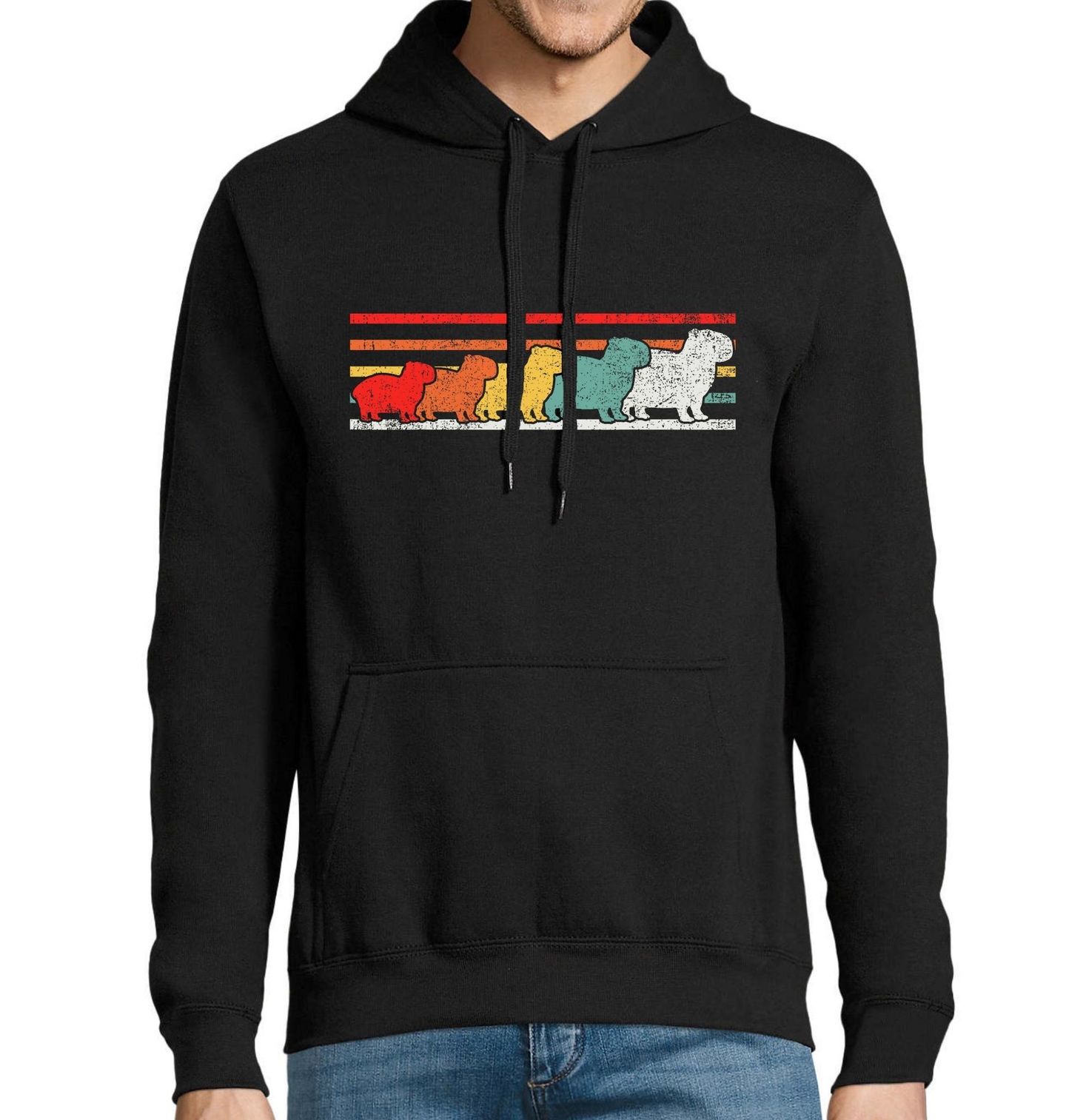 Pánská mikina Retro Kapybary v řadě. Kapybara, známá jako největší hlodavec na světě, v barevném proužkovém designu. Perfektní pro všechny, kdo milují tato klidná a roztomilá zvířata. Kapybara je symbolem pohody a relaxu — ukaž svůj styl s tímto originálním tričkem s kapybarou!