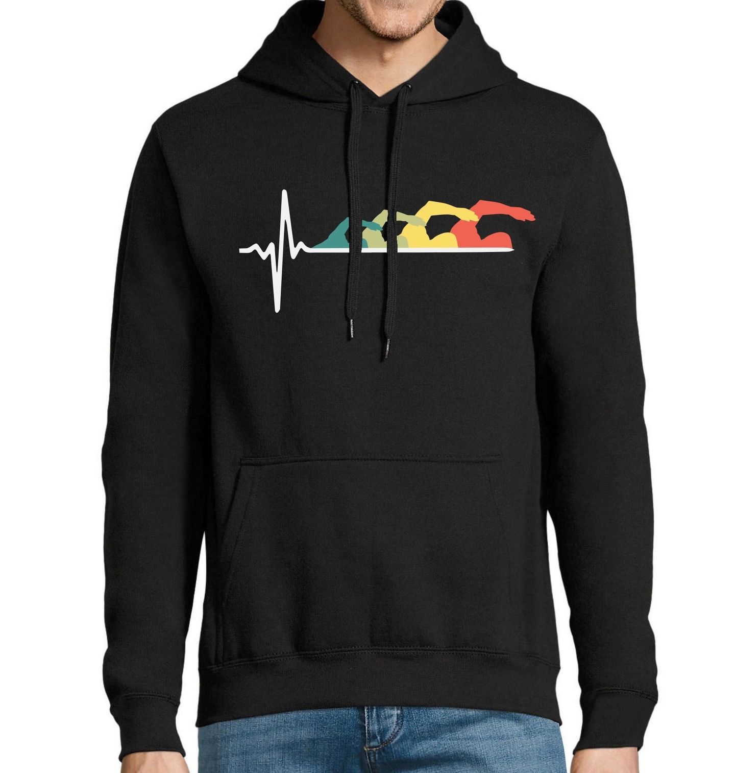 Pánská mikina Retro Kardiogram Plavání Kraul. Minimalistický sportovní motiv propojuje kardiogram s dynamikou plavání v kraulovém stylu. Barevné siluety plavců znázorňují plynulý pohyb paží a rytmus záběru, který se symbolicky mění v tep srdce. Design vyjadřuje vytrvalost, soustředění a lásku k vodě.
