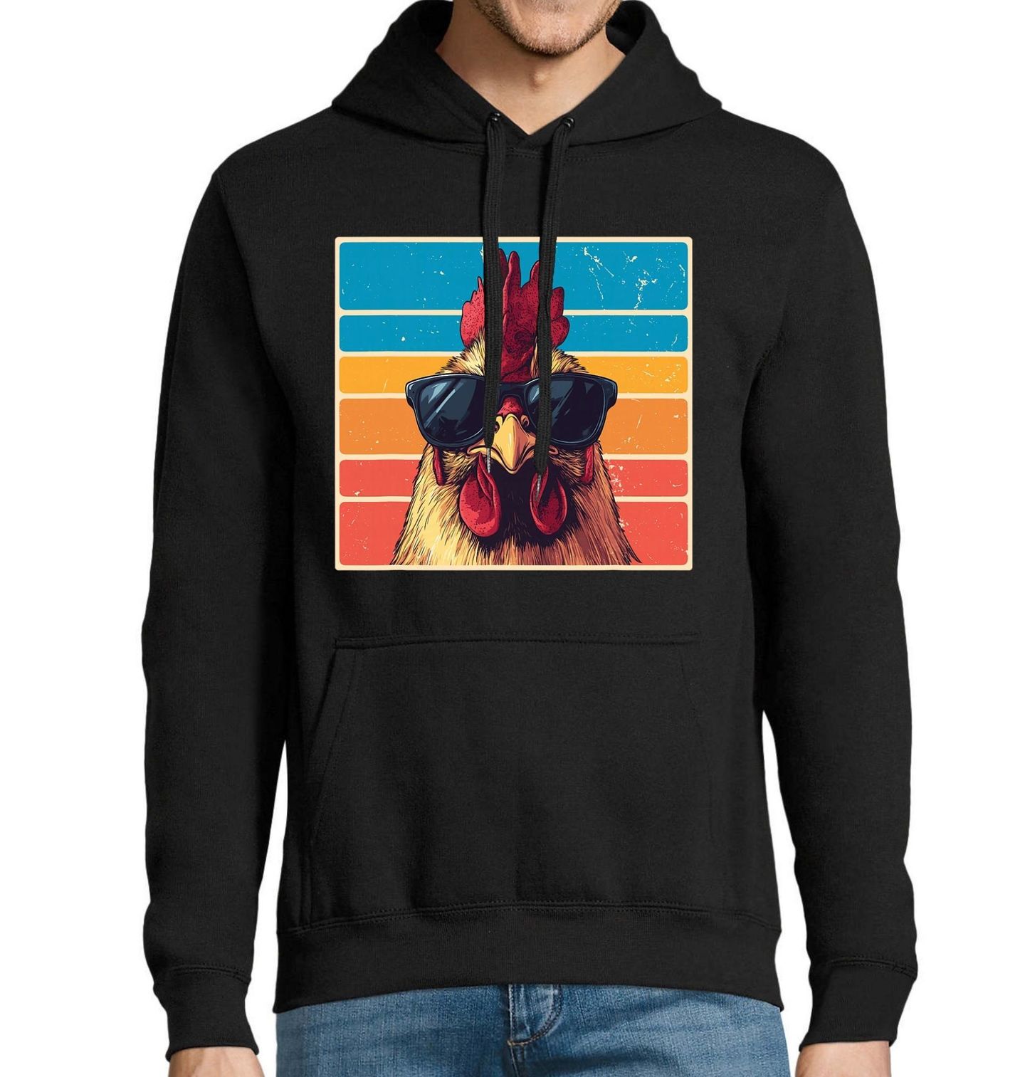 Pánská mikina Retro Kohout s Brýlemi. Design kombinuje výrazného kohouta s tmavými brýlemi a barevné retro pruhy, které evokují letní atmosféru a pohodu. Tento design je skvělou volbou pro ty, kteří chtějí vyjádřit uvolněný styl a smysl pro humor.