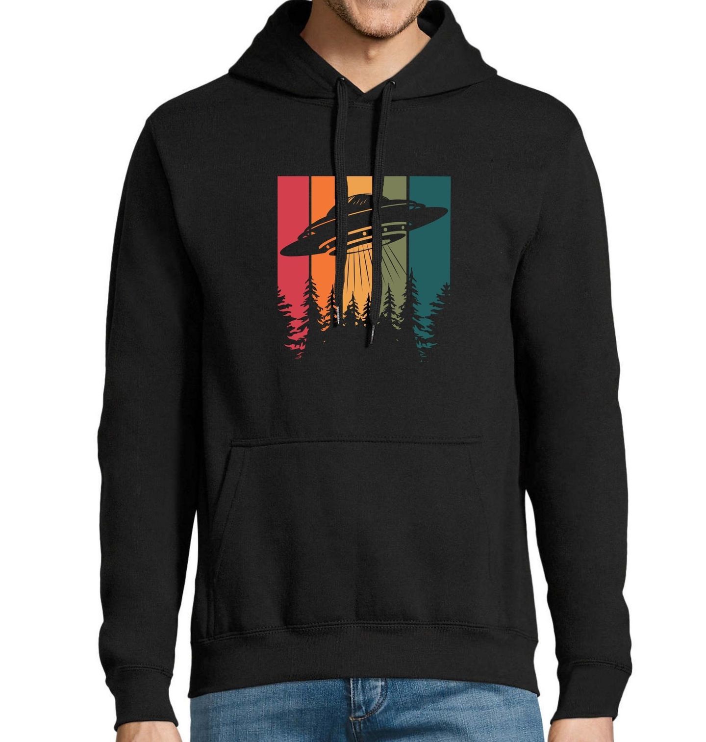 Pánská mikina Retro Létající talíř UFO. Tričko s výrazným motivem létajícího talíře UFO levitujícího nad temným lesem je dokonalou volbou pro milovníky tajemna, sci-fi a záhad. Silueta stromů v popředí kontrastuje s barevnými pruhy v pozadí, které evokují západ slunce. Z vesmírné lodi vystupuje světelný paprsek, který naznačuje únos mimozemšťany.