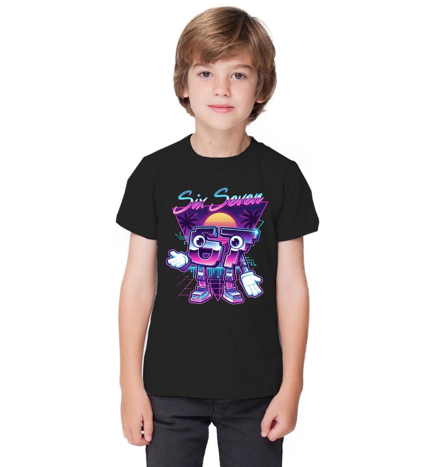 Dětské tričko Retro Meme 67 Six Seven 80s. Stylový a zábavný motiv 67 ve stylu six seven meme laděný do ikonického retro 80s designu. Veselé číslice s očima a úsměvem stojí před neonovým západem slunce, palmami a futuristickým pozadím – přesně jako z éry arkád, vaporwave a barevných kazetových přehrávačů.