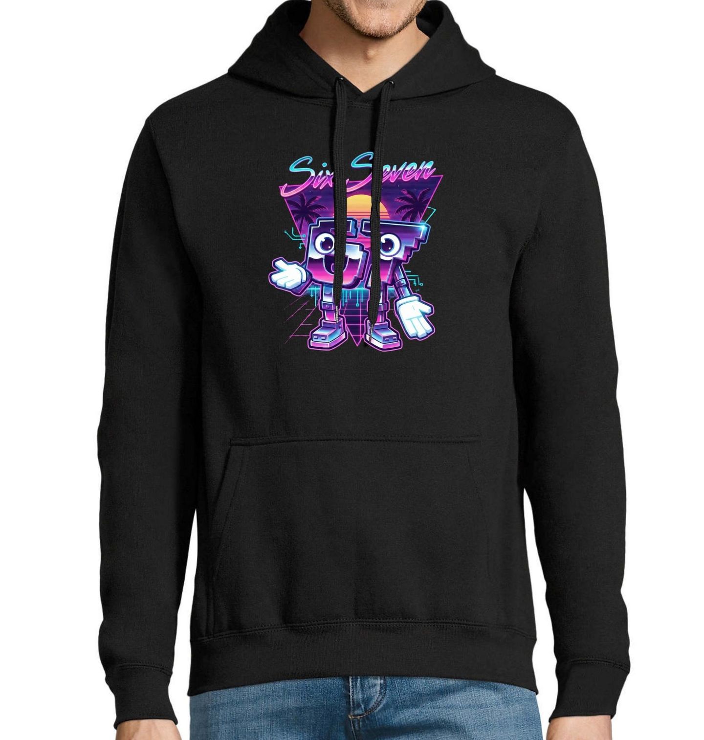 Pánská mikina Retro Meme 67 Six Seven 80s. Stylový a zábavný motiv 67 ve stylu six seven meme laděný do ikonického retro 80s designu. Veselé číslice s očima a úsměvem stojí před neonovým západem slunce, palmami a futuristickým pozadím – přesně jako z éry arkád, vaporwave a barevných kazetových přehrávačů.