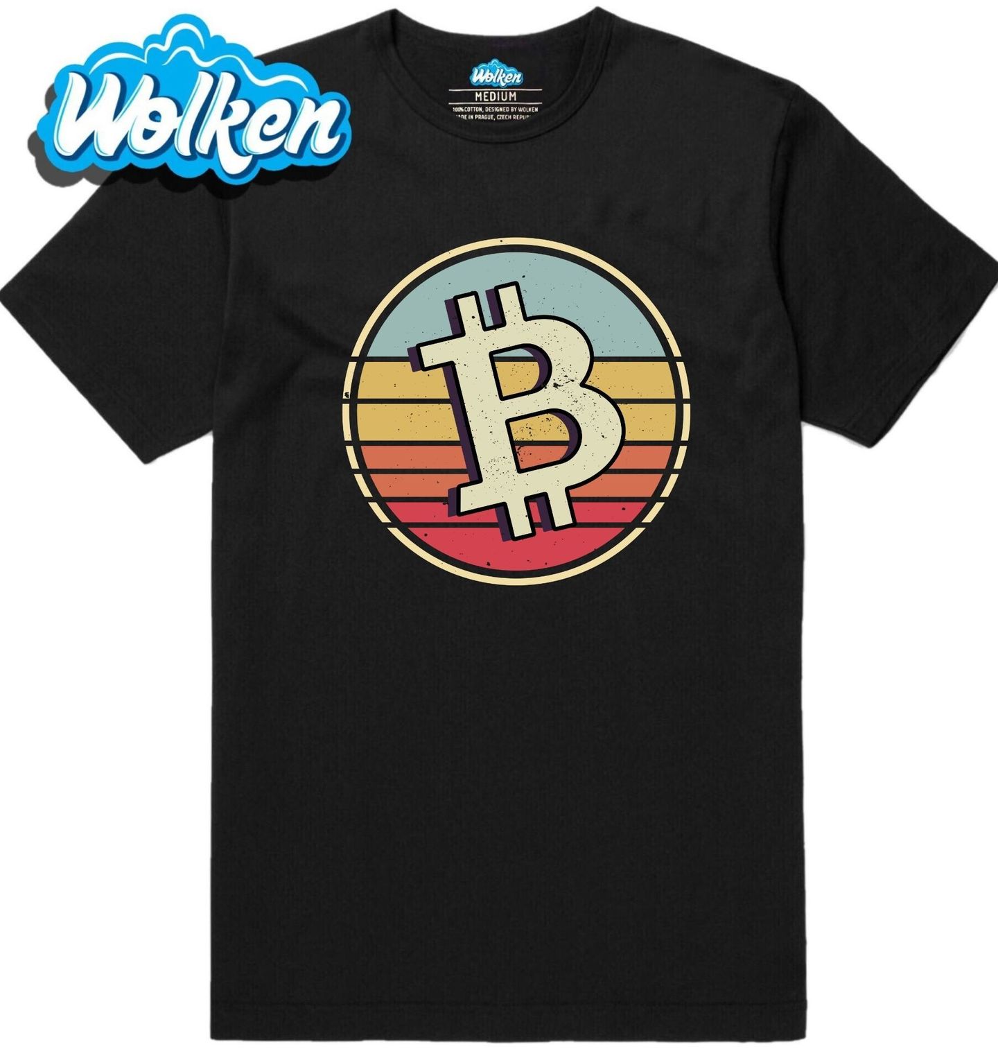 Pánské tričko Retro Mince Bitcoin. Stylový motiv retro Bitcoin je ideální volbou pro všechny fanoušky kryptoměn, kteří milují kombinaci moderní technologie a nostalgického vzhledu. Na designu dominuje ikonické logo Bitcoin v retro kruhu s teplými odstíny oranžové, žluté a modré.