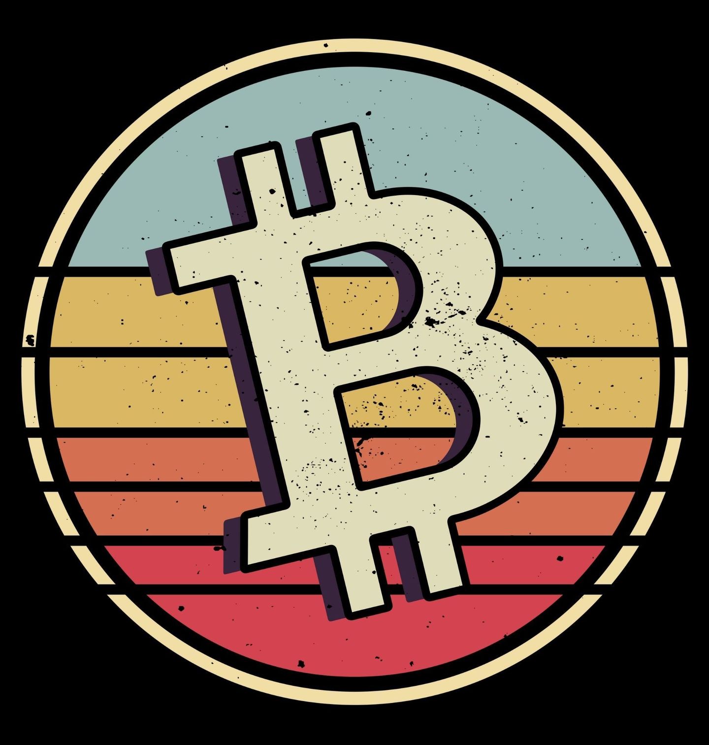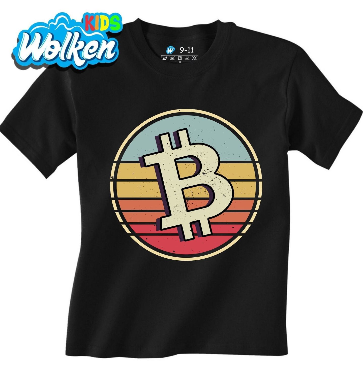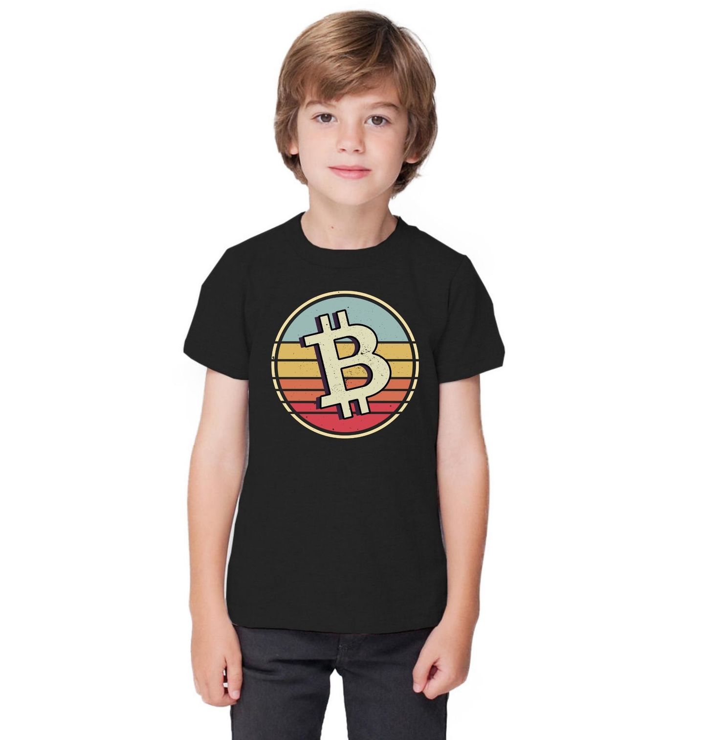 Dětské tričko Retro Mince Bitcoin. Stylový motiv retro Bitcoin je ideální volbou pro všechny fanoušky kryptoměn, kteří milují kombinaci moderní technologie a nostalgického vzhledu. Na designu dominuje ikonické logo Bitcoin v retro kruhu s teplými odstíny oranžové, žluté a modré.