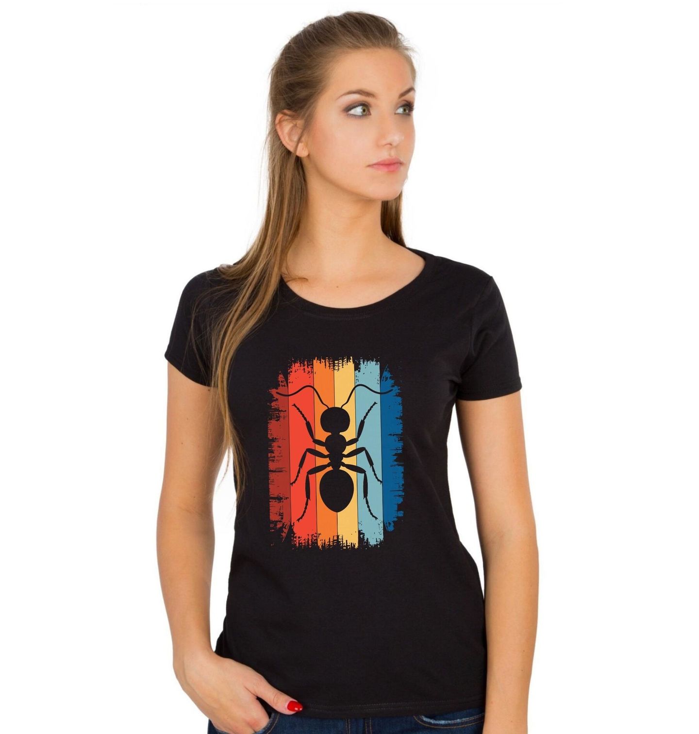 Dámské tričko Retro Mravenec. Originální motiv, ve kterém hraje hlavní roli mravenec v siluetě, zasazený do barevného pruhu ve stylu retro. Ideální pro každého, kdo miluje přírodu, hmyz, originální grafiku a zároveň má slabost pro vintage styl. Mravenec je symbolem píle, síly a týmové práce — tohle je kousek, který zaujme na první pohled a skvěle doplní šatník každého milovníka přírody i designu.