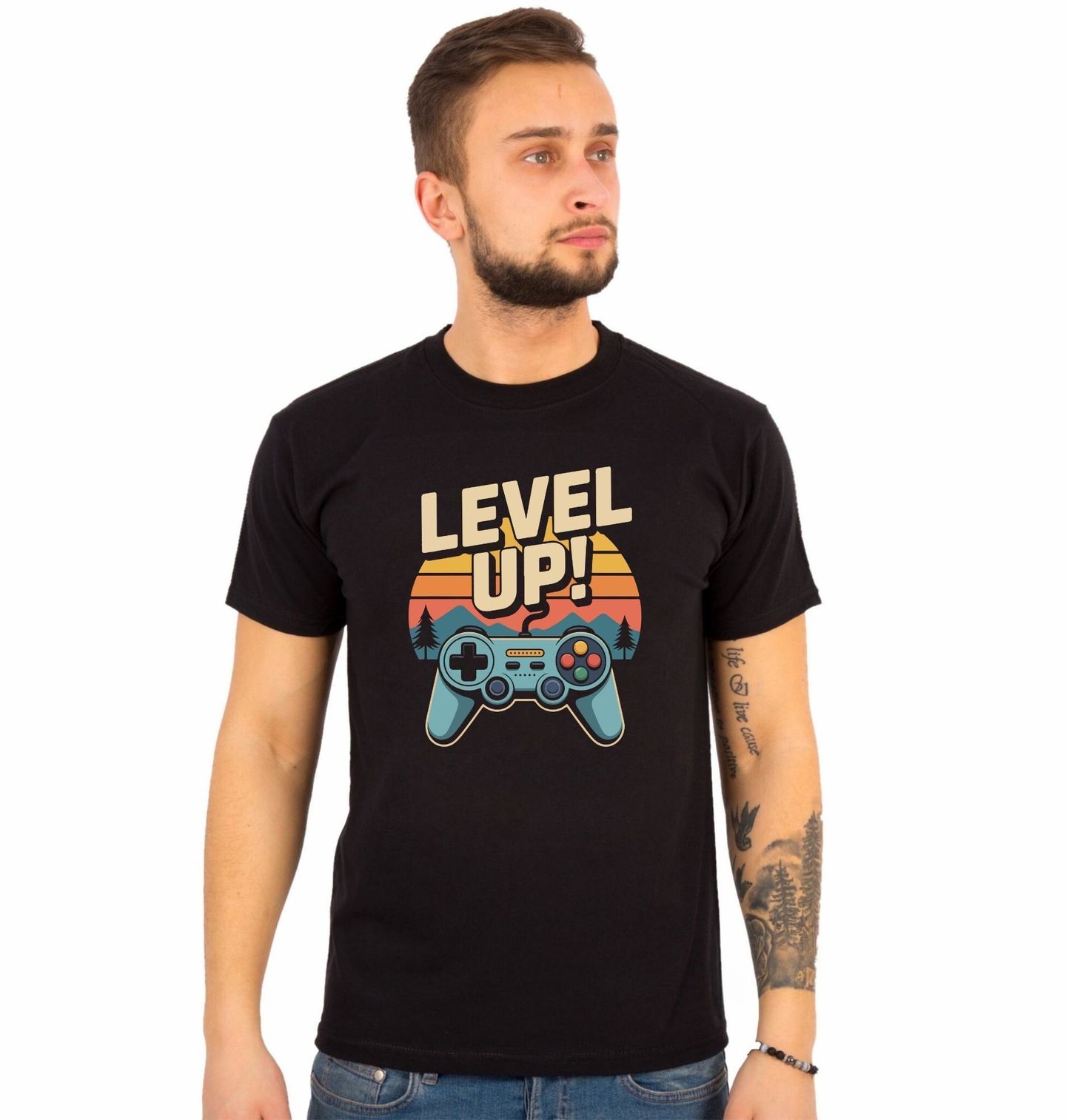 Pánské tričko Retro Ovladač LEVEL UP. Originální motiv retro ovladač s nápisem „LEVEL UP!“ potěší každého, kdo je srdcem hráč a zapálený gamer. Stylový herní design v retro barvách spojuje nostalgii starých konzolí s moderním herním světem. Skvělá volba pro každého, kdo miluje videohry, zábavu a chce ukázat svou herní duši.