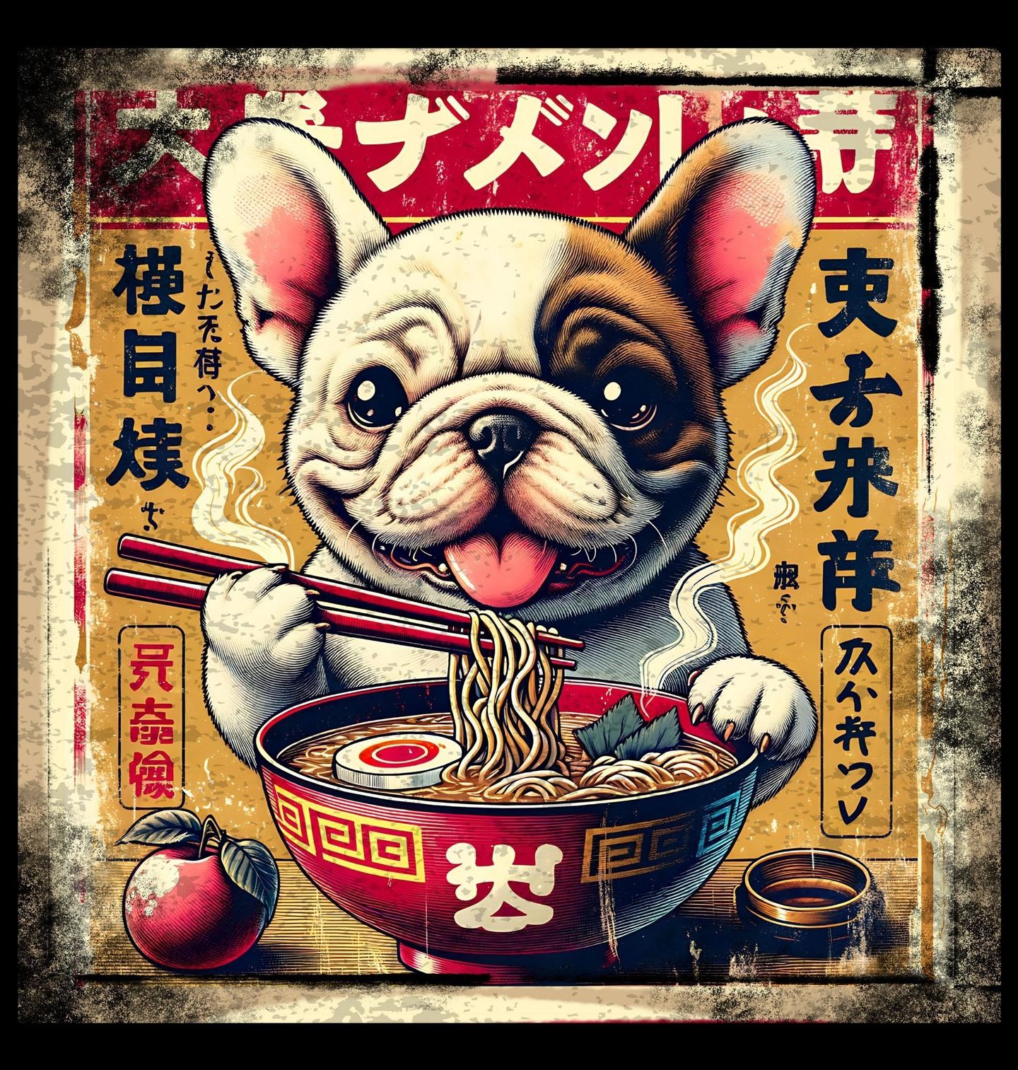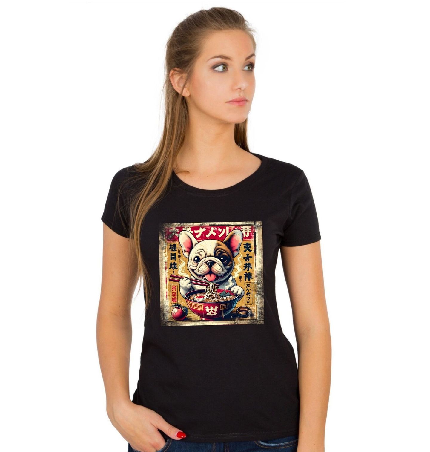 Dámské tričko Retro Plakát Buldoček a Ramen. Zamiluj si tenhle originální potisk. Roztomilý francouzský buldoček, který si vychutnává misku horkého ramenu ve stylu tradičního Japonska. Skvělá volba pro každého, kdo je miluje ramen, Japonsko nebo má doma psa.