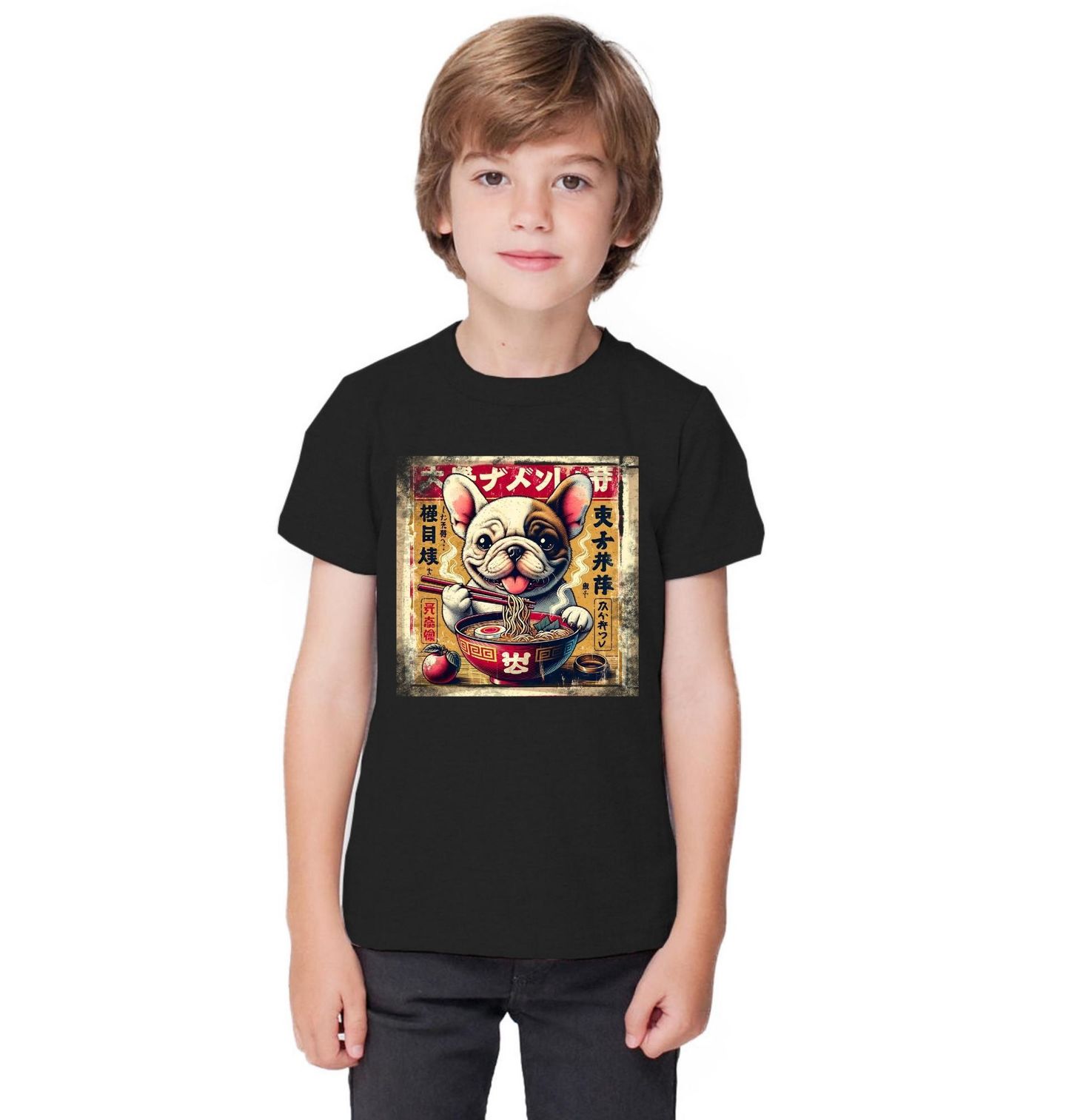 Dětské tričko Retro Plakát Buldoček a Ramen. Zamiluj si tenhle originální potisk. Roztomilý francouzský buldoček, který si vychutnává misku horkého ramenu ve stylu tradičního Japonska. Skvělá volba pro každého, kdo je miluje ramen, Japonsko nebo má doma psa.
