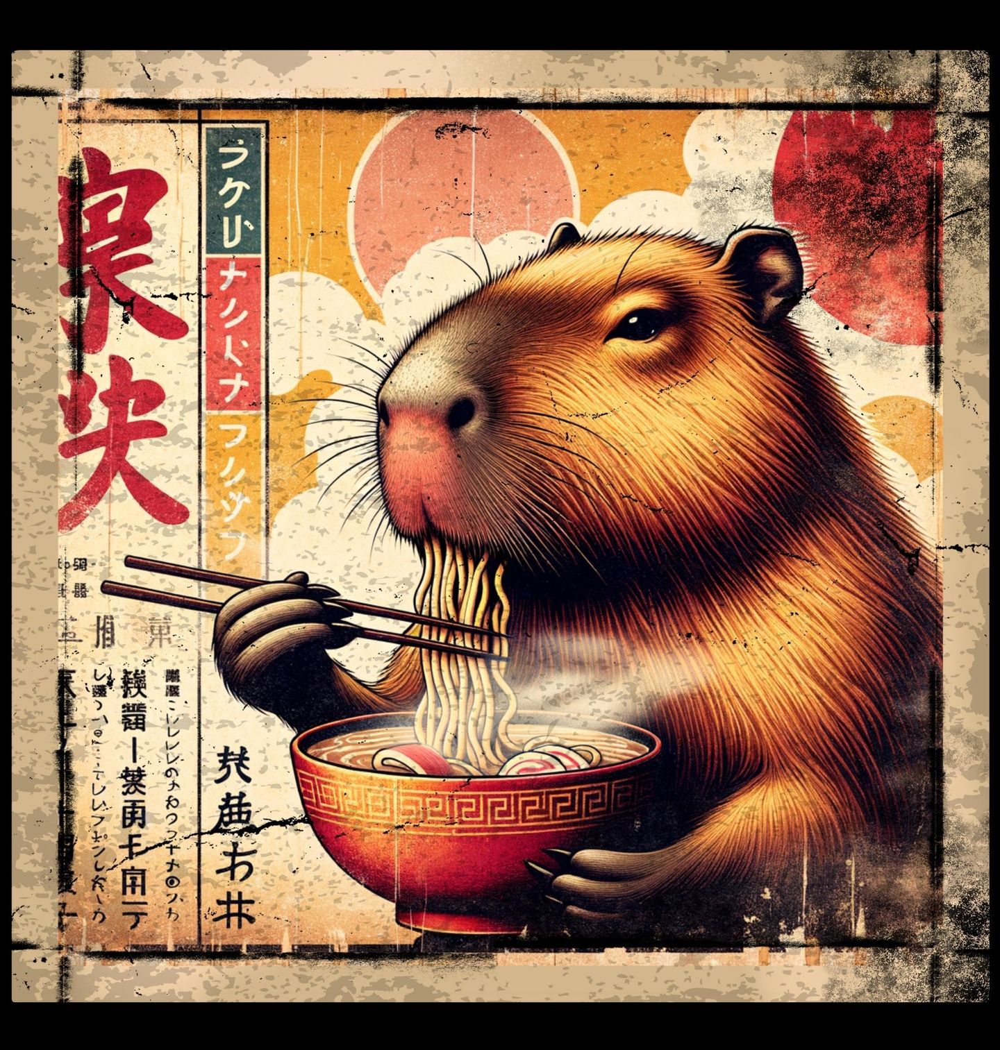 Dětské tričko Retro Plakát Kapybara a Horký Ramen. Stylový hlodavec s hůlkami, miska plná horkého ramenu a staré Japonsko – to je dokonalá kombinace pro milovníky originálního designu, jídla i zvířat. Tento motiv v retro stylu působí jako starý japonský plakát a přináší neotřelý pohled na chvíle pohody u dobrého jídla.