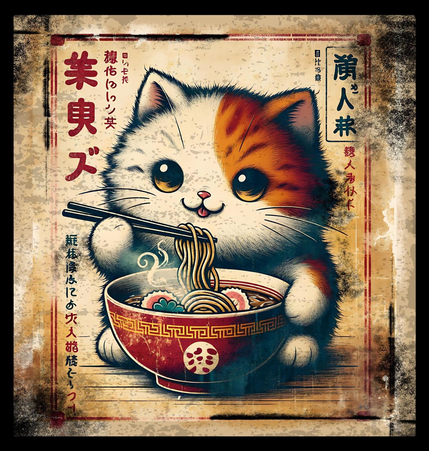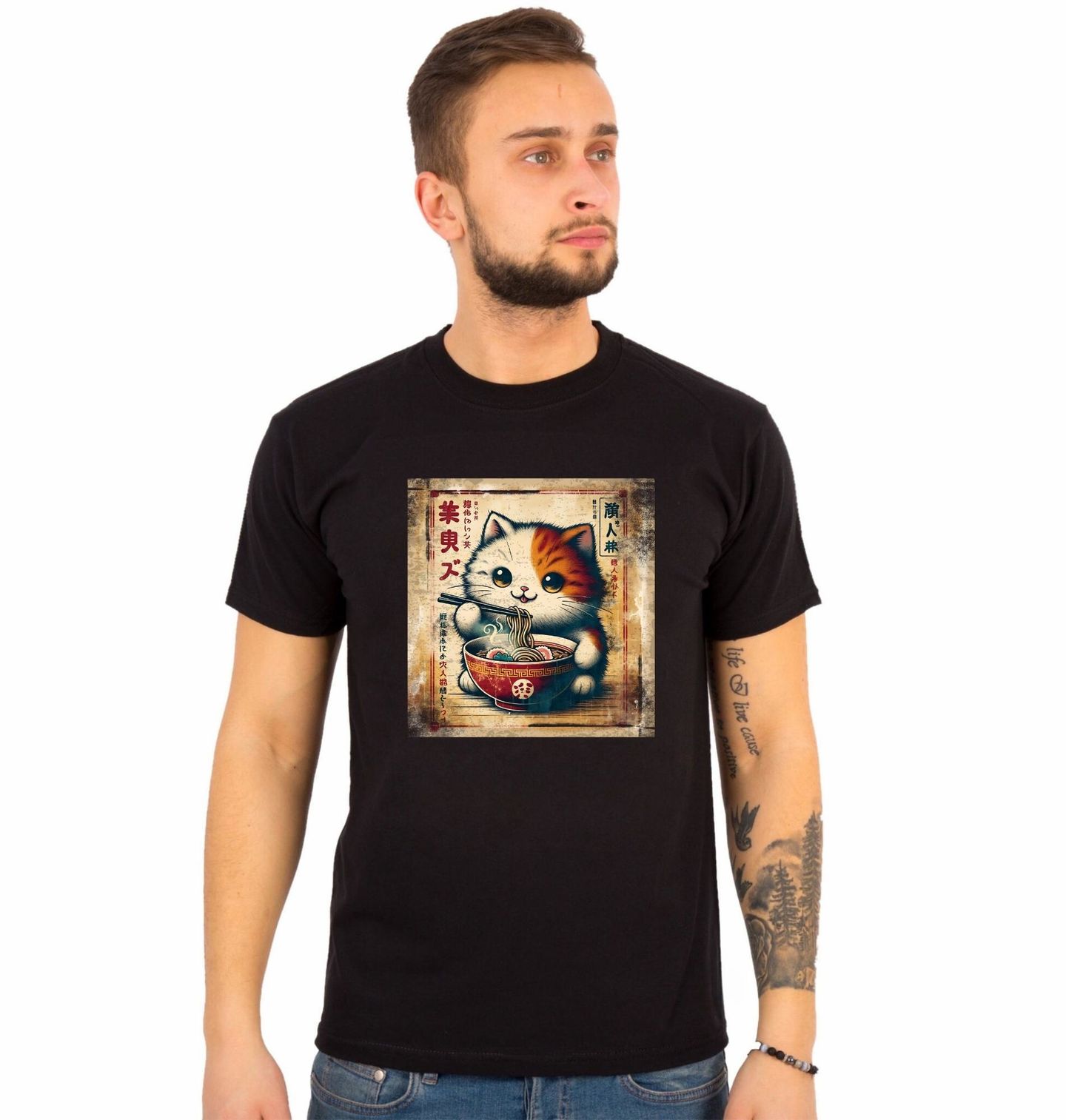 Pánské tričko Retro Plakát Kočka a Horký Ramen. Kočka, ramen a Japonsko – tři věci, které si zamiluje každý fanoušek asijské kultury! Tento originální plakát zachycuje roztomilou kočku, jak si pochutnává na misce tradičního ramenu, a to vše ve stylu retro japonských reklam.