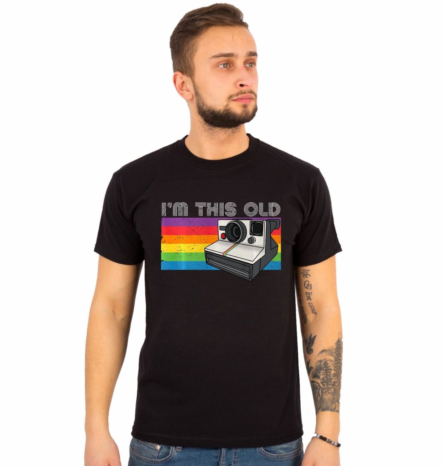 Pánské tričko Retro Polaroid I’m this old. Legendární vintage foťák Polaroid s duhovým páskem a nápisem „I’m this old“ (v překladu „Jsem tak starý“) rozesměje každého pamětníka. Tento retro fotoaparát dokázal něco, co tehdy působilo jako kouzlo – vyfotil a hned vytiskl fotku přímo do ruky. Perfektní motiv pro všechny milovníky fotografování nebo ty, kdo rádi rozesmějí své okolí.