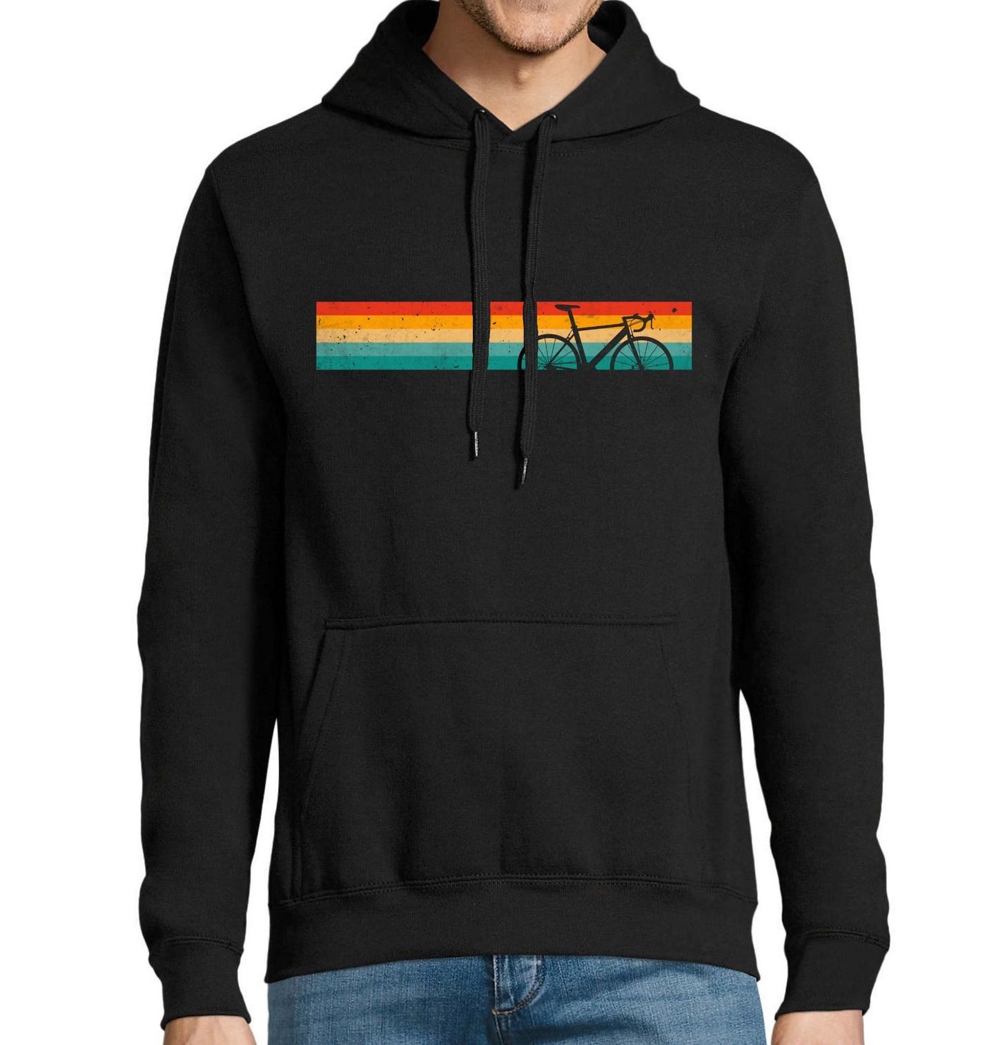 Pánská mikina Retro Silniční Kolo. Miluješ jízdu na kole a zároveň máš slabost pro retro styl? Originální silueta silničního kola na pozadí vintage pruhů v tónech oranžové, žluté, béžové a tyrkysové dodává každému outfitu šmrnc. Ideální pro každodenní nošení, na vyjížďky nebo jako dárek pro nadšeného