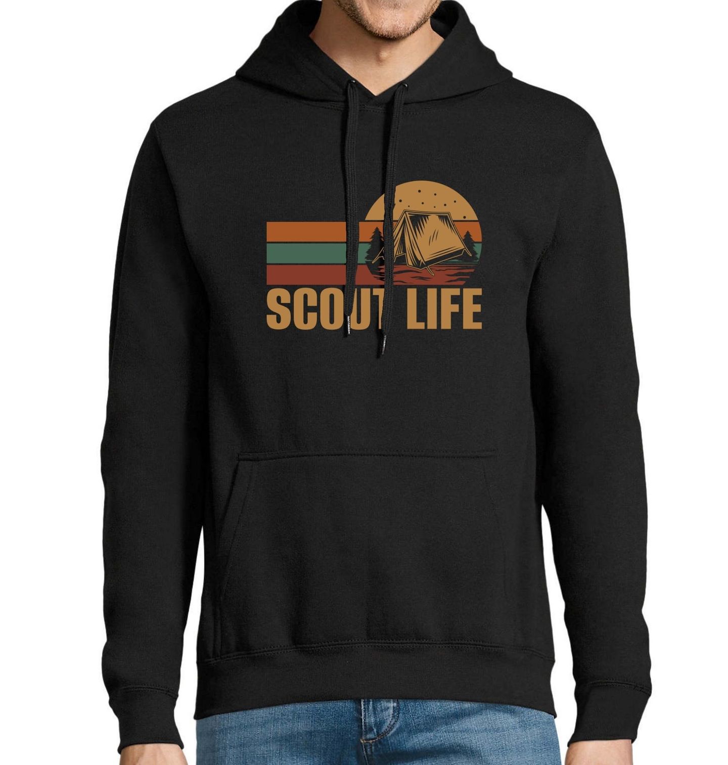 Pánská mikina Retro Skautský život. Motiv stanu, západu slunce, lesů a nápis Scout Life navodí atmosféru večerního táboráku, vůně borovic a dobrodružného cestování. Ideální pro milovníky campingového života, retro stylu a skautských vzpomínek. Ať už jsi stále aktivní skaut, nebo jen duší táborník – tohle tričko tě vezme zpátky do přírody.
