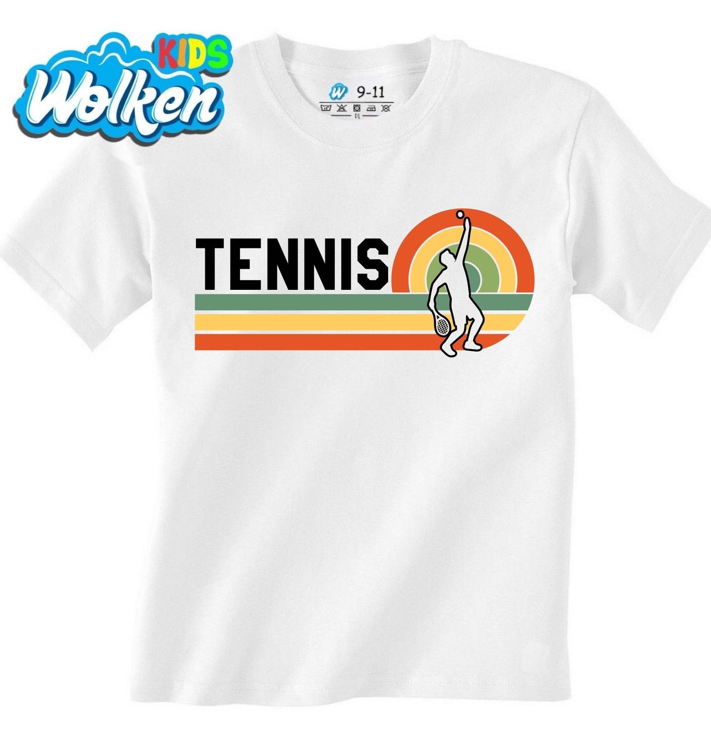 Dětské tričko Retro TENNIS. Tento originální motiv v retro stylu je jako stvořený pro všechny, kdo milují tenis, barvy minulých dekád a klasický design. Silueta hráče při podání, výrazné duhové pruhy a výrazný nápis TENNIS evokují atmosféru staré školy, kdy byl sport nejen o výkonu, ale i o stylu.
