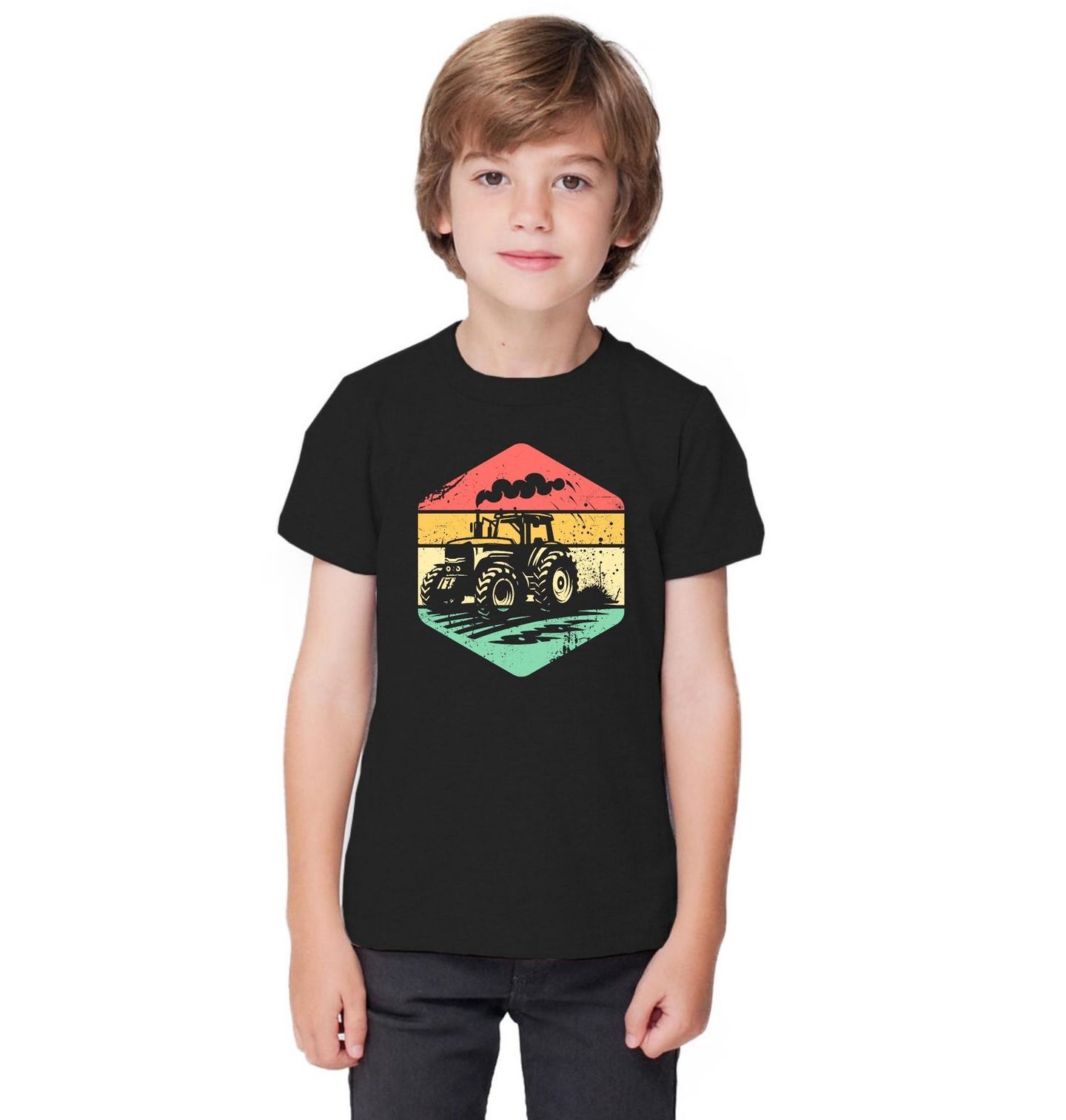 Dětské tričko Retro Traktor. Tento originální vintage motiv spojuje vášeň pro traktor, lásku k práci na poli a srdce každého pravého farmáře. Silueta mohutného traktoru v kontrastu se stylovým barevným pozadím dává jasně najevo, kdo je pánem zemědělství!