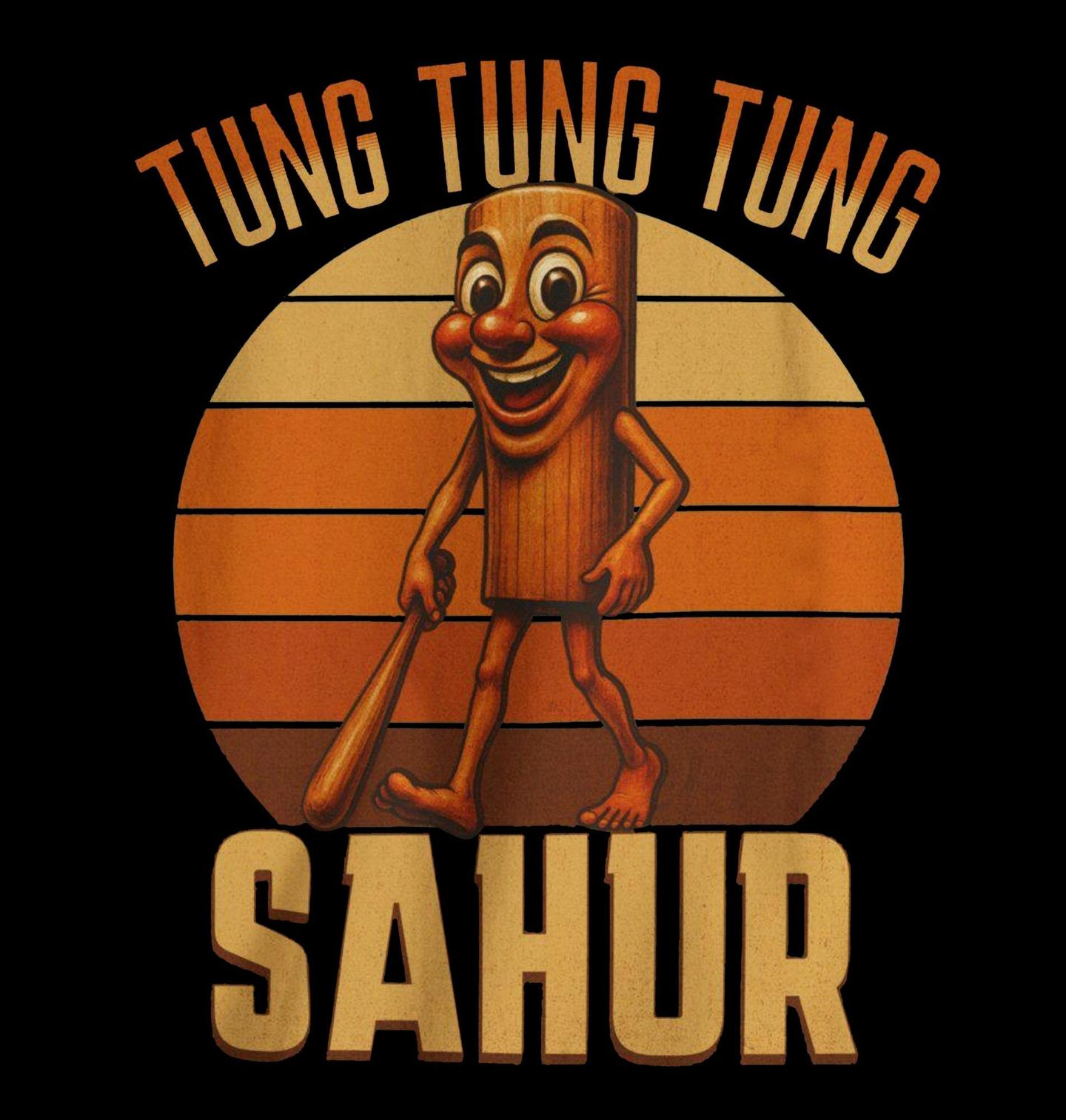 Dámské tričko Retro Tung Tung Tung Sahur. Když se spojí italský brainrot a tung tung tung sahur, vznikne motiv, který je stejně absurdní jako nezapomenutelný. Na tomto tričku kráčí dřevěná bytost s pálkou v ruce, připravená probudit celou vesnici... nebo jen vaše okolí šokovat dokonalým internetovým memem.
