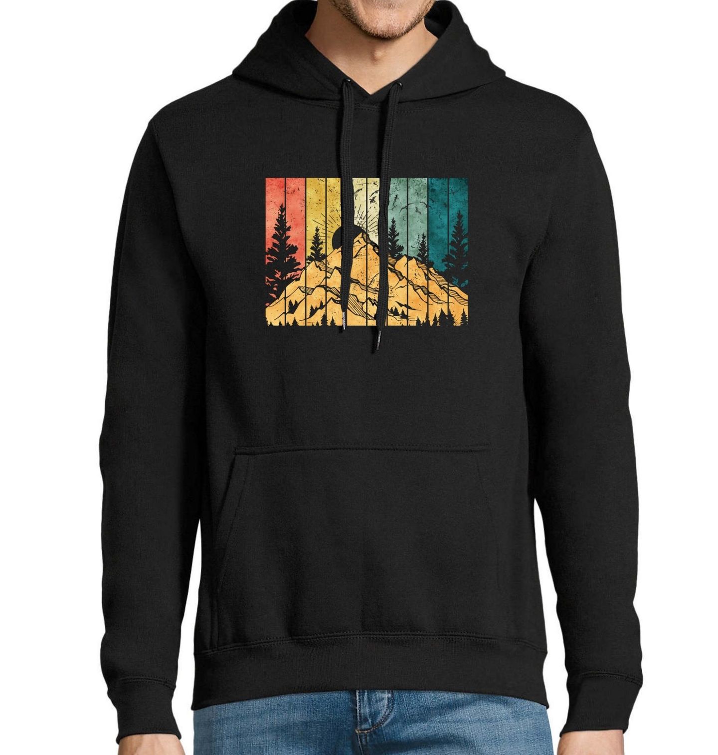 Pánská mikina Retro Západ slunce nad Horami. Retro motiv horské krajiny a tmavého lesa, který je rozdělen do svislých barevných pruhů ve vintage odstínech červené, žluté, zelené a modré. Uprostřed vystupují dramatické siluety hor, borovic a zapadajícího slunce, obklopeného letícími ptáky – připomínka svobody, ticha a síly přírody.