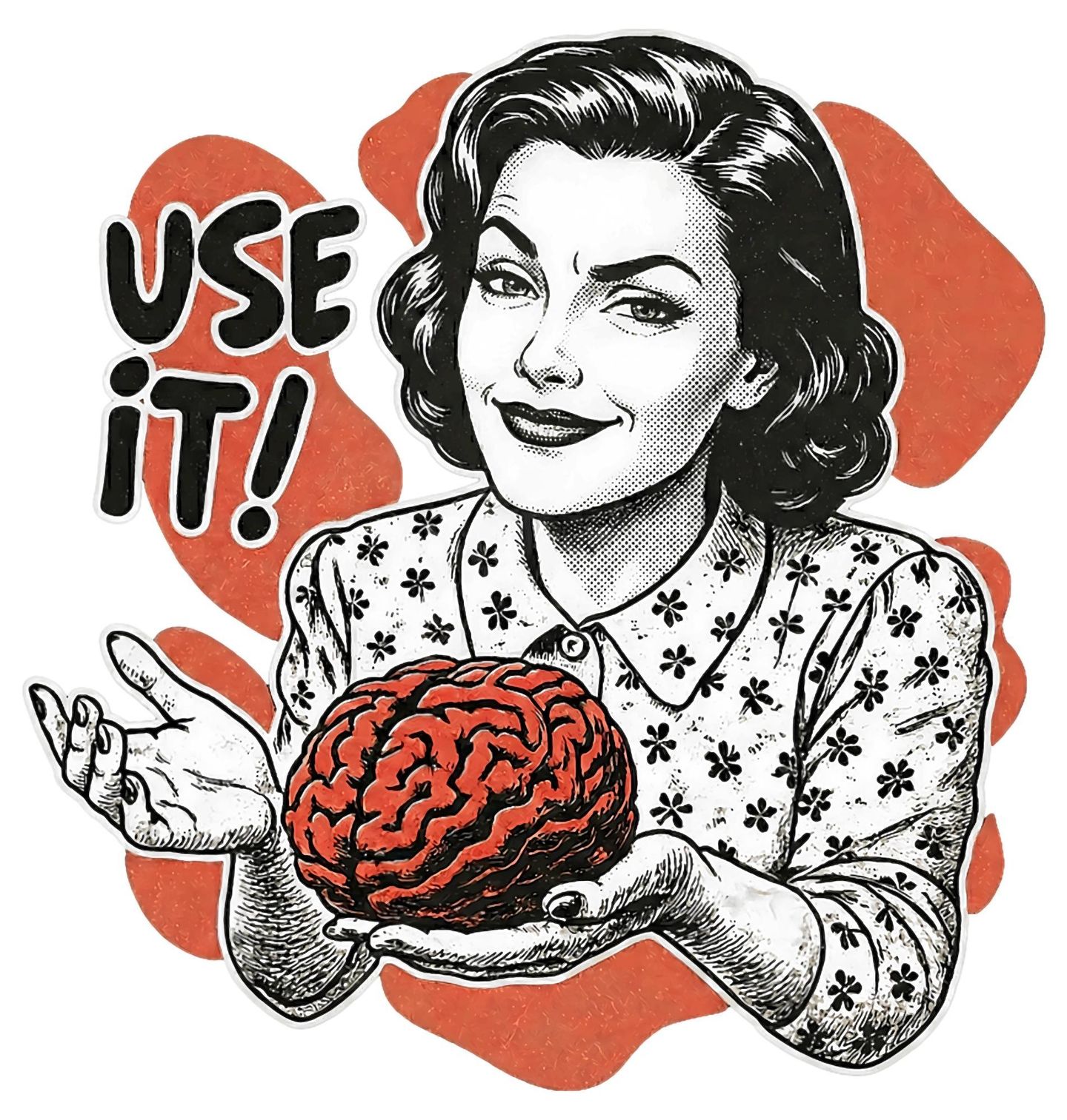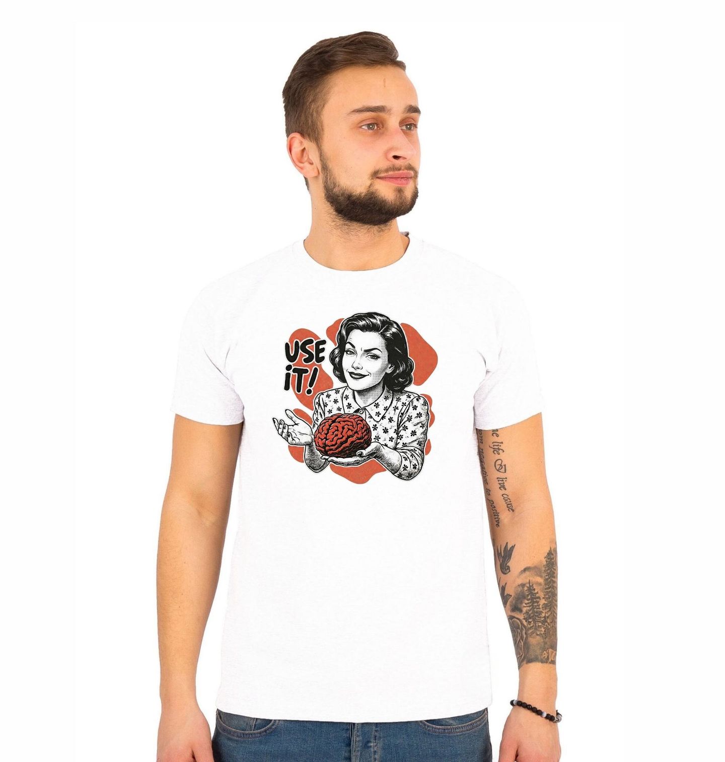 Pánské tričko Retro Žena Použij Mozek Use it! Originální a lehce sarkastický motiv, kde retro žena v komiksovém vintage stylu drží v rukou mozek a s úsměvem dodává: „USE IT!“ – neboli česky „POUŽIJ TO!“. Ideální kousek pro všechny, kteří milují humor, ironii a chytré narážky na zdravý rozum.