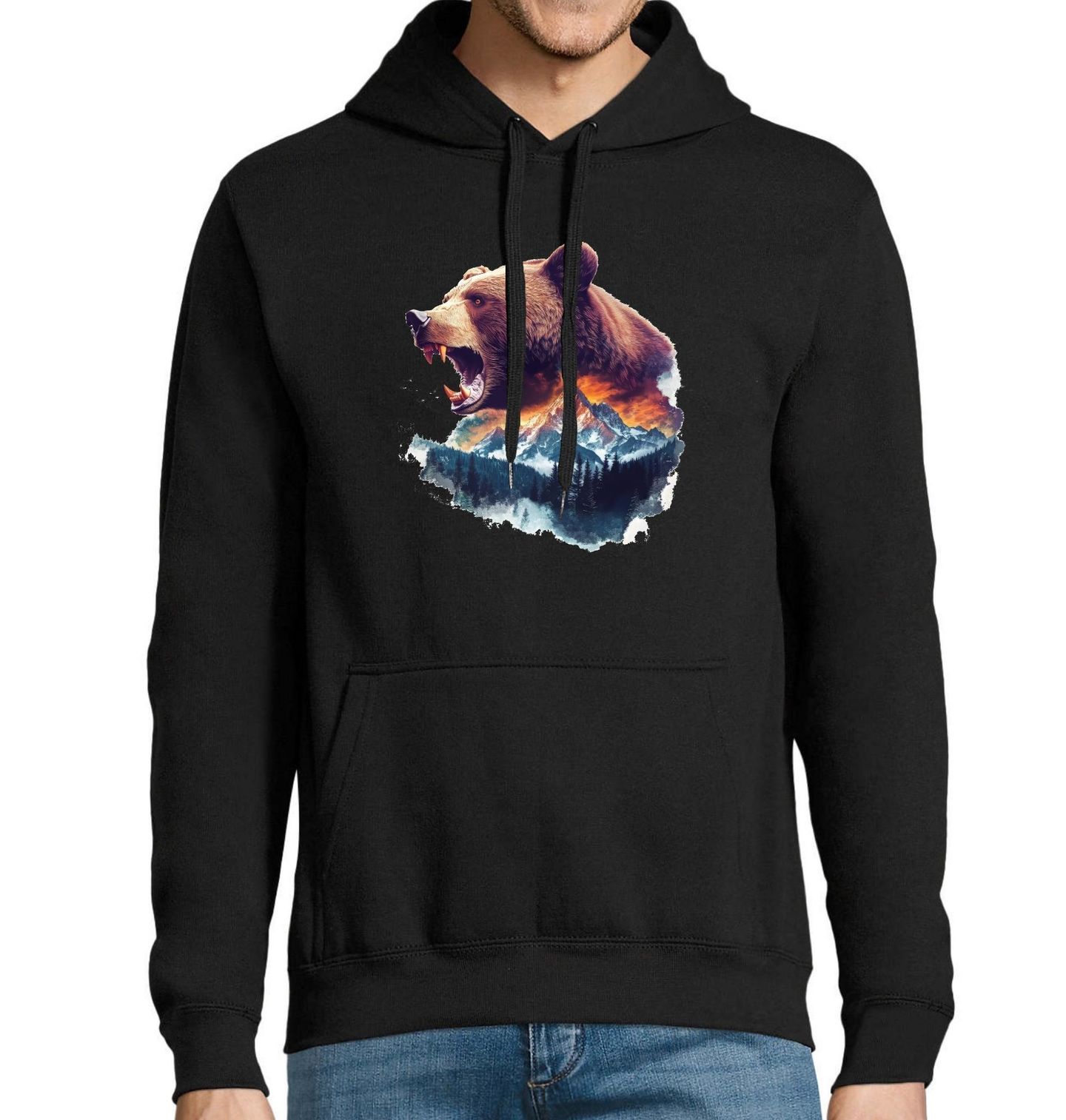 Pánská mikina Řev Medvěda nad Horami. Síla divočiny vtělená do jednoho designu – tričko s majestátním motivem zuřícího medvěda grizzlyho, který se vynořuje z horské scenérie obklopené hlubokým lesem. Tento motiv spojuje nespoutanou sílu přírody, svobodu hor a klid tajemného lesa. Ideální pro každého, kdo v sobě nosí ducha divočiny.