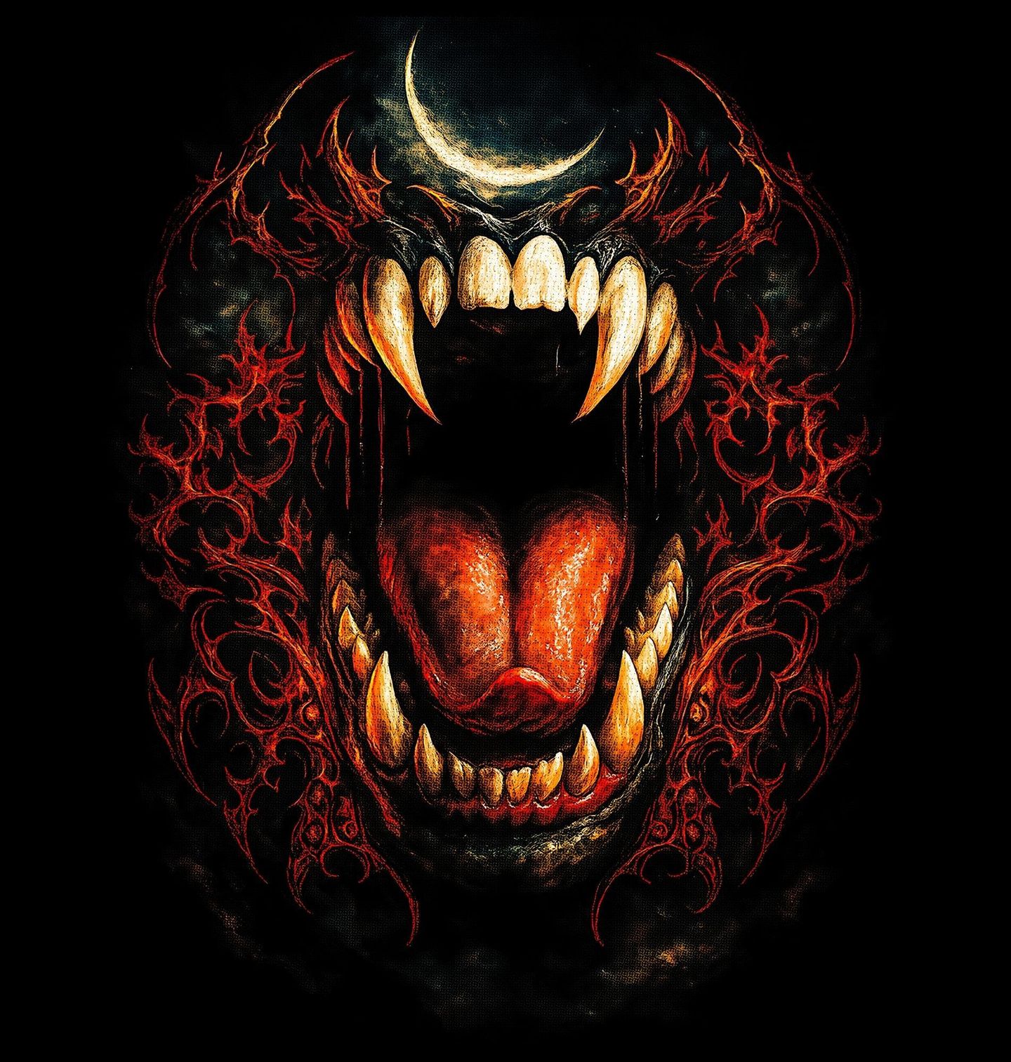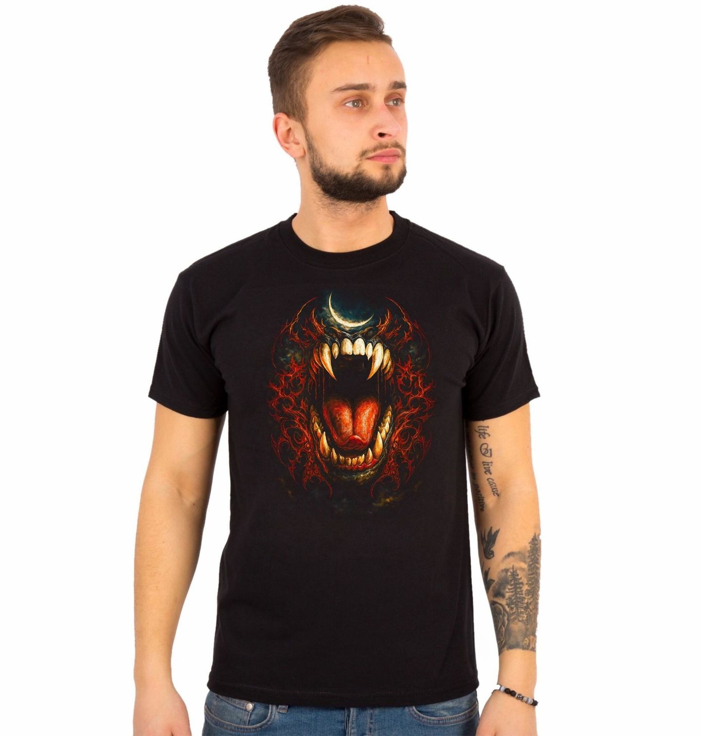 Pánské tričko Řev pod Temným Měsícem. Temný a hypnotizující motiv, kde dominuje surový řev, který se dere z hlubin instinktu a síly. Otevřená tlama plná ostrých tesáky působí agresivně a nekompromisně, zatímco nad vším bdí tajemný měsíc, dodávající celé scéně mystickou atmosféru. Tento design propojuje divokost a temnotu – řev zde symbolizuje vnitřní sílu a nezkrotnou energii, tesáky představují nebezpečí a dominanci a měsíc podtrhuje noční, téměř nadpřirozený nádech.