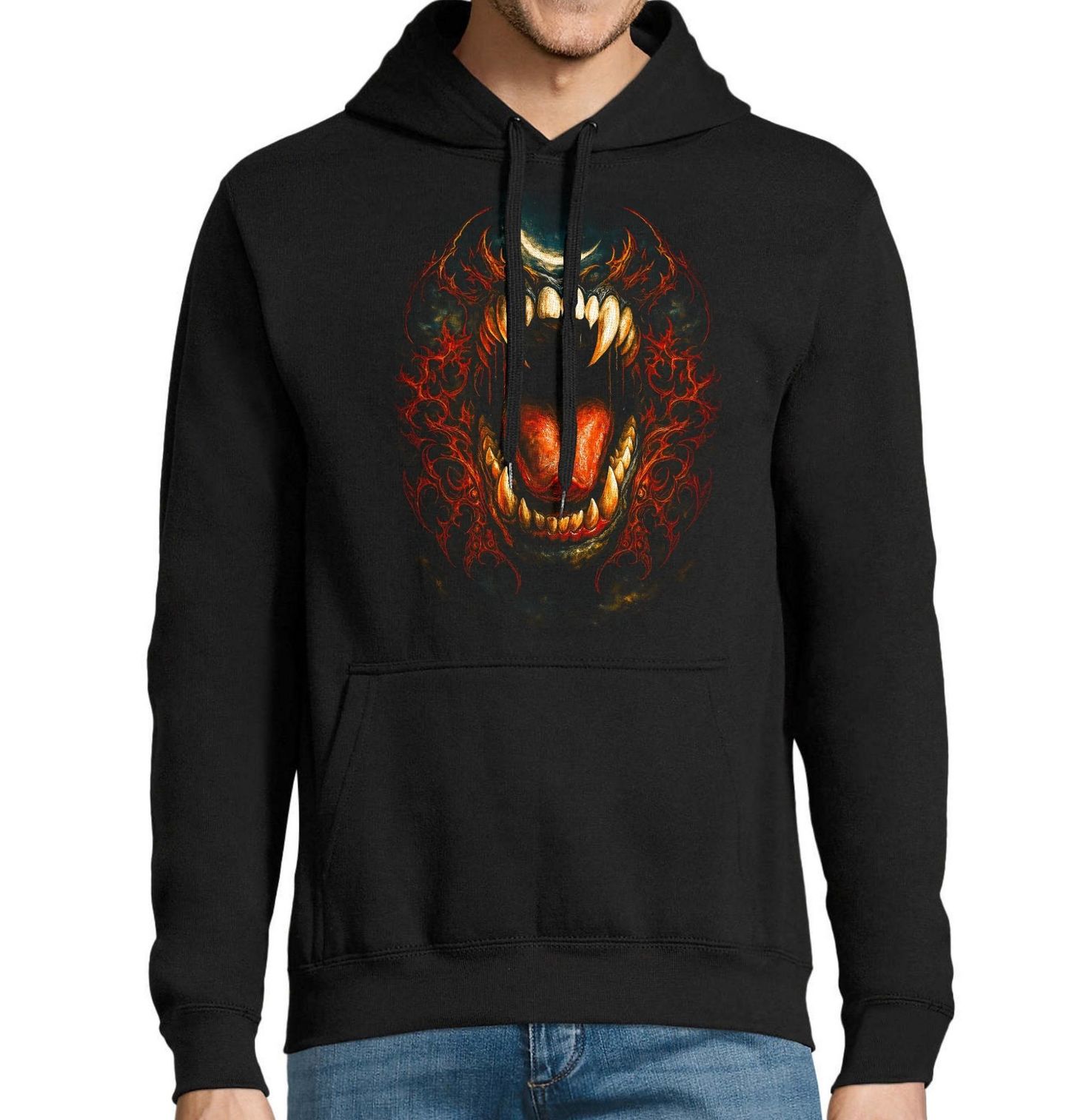 Pánská mikina Řev pod Temným Měsícem. Temný a hypnotizující motiv, kde dominuje surový řev, který se dere z hlubin instinktu a síly. Otevřená tlama plná ostrých tesáky působí agresivně a nekompromisně, zatímco nad vším bdí tajemný měsíc, dodávající celé scéně mystickou atmosféru. Tento design propojuje divokost a temnotu – řev zde symbolizuje vnitřní sílu a nezkrotnou energii, tesáky představují nebezpečí a dominanci a měsíc podtrhuje noční, téměř nadpřirozený nádech.